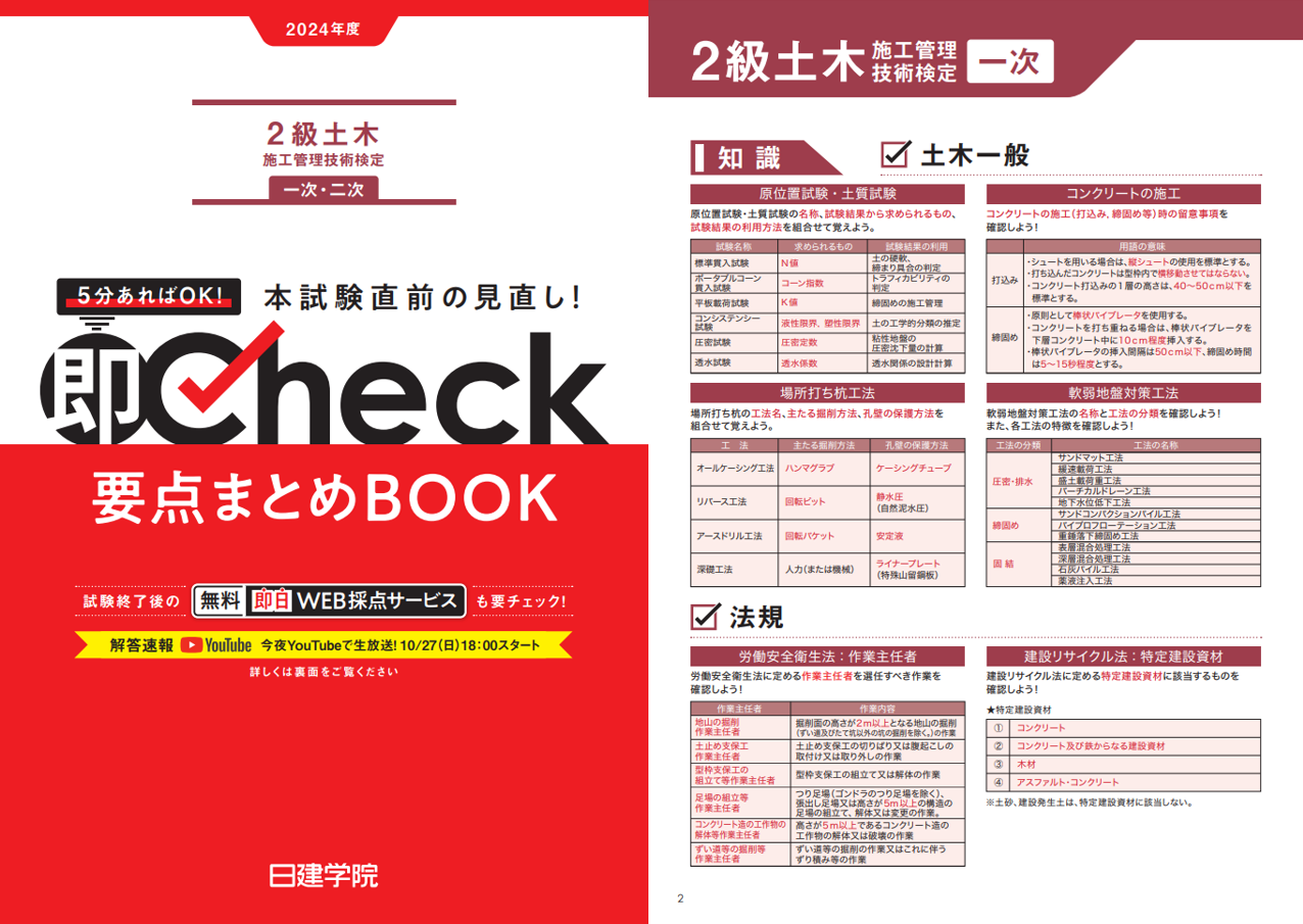 2級土木施工管理技士 一次検定の重要ポイントをチェックできる「要点まとめBOOK」です。事前にダウンロードして各項目を確認のうえ、YouTube配信に備えましょう!