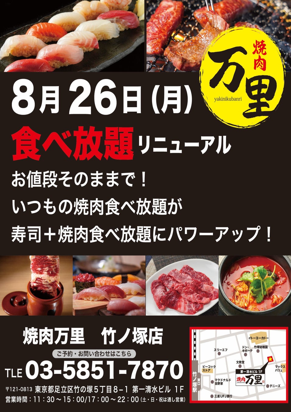 「焼肉万里」竹ノ塚店の食べ放題がパワーアップ!寿司+焼肉食べ放題が2,600円(税抜)から