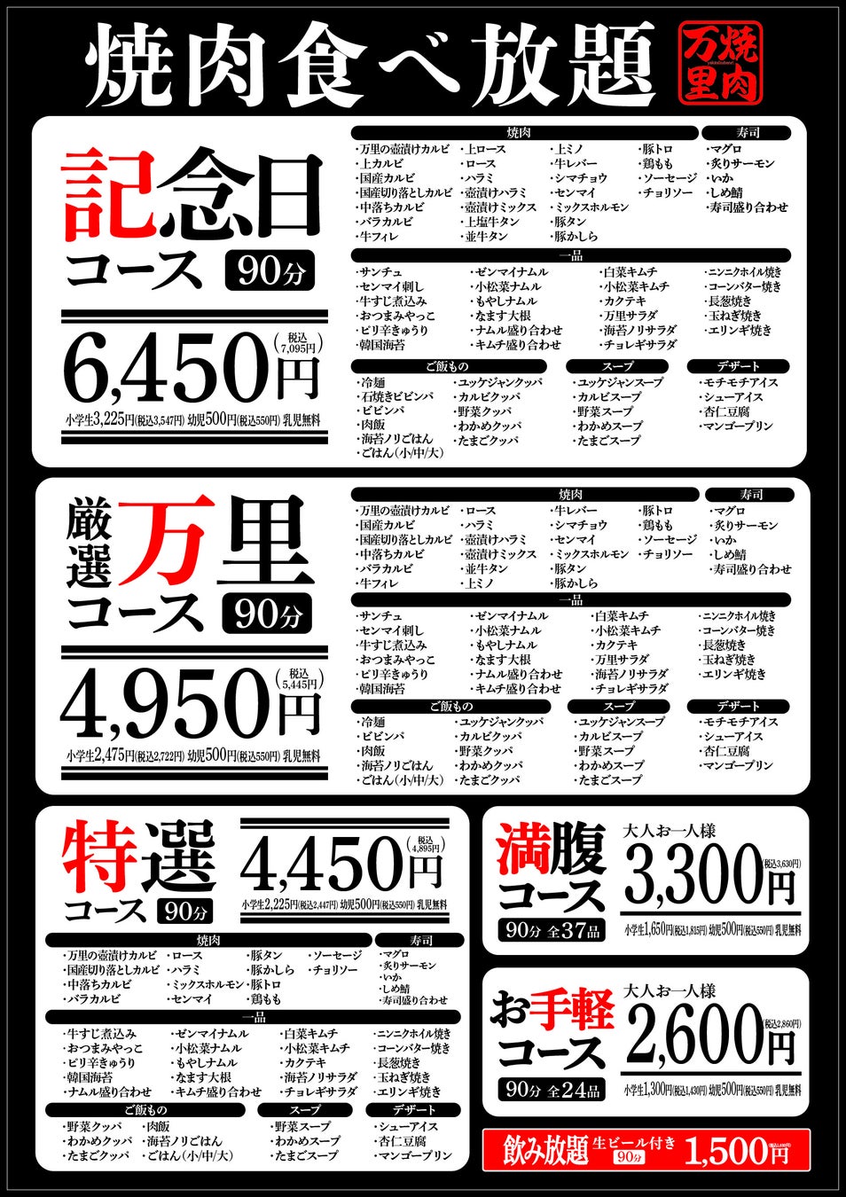 ⾁問屋の⽬利きのプロが上質な⽜⾁を選び、職⼈が一枚一枚丁寧に⼿切りすることにこだわった「焼肉万里」竹ノ塚店では、「お手軽コース」から「記念日コース」まで、ご予算や内容に応じて選べる6種類の食べ放題コースをご用意しております。この度のリニューアルでは、現行の食べ放題メニューに新たに『寿司』が加わり、よりご満足いただける内容となっております。