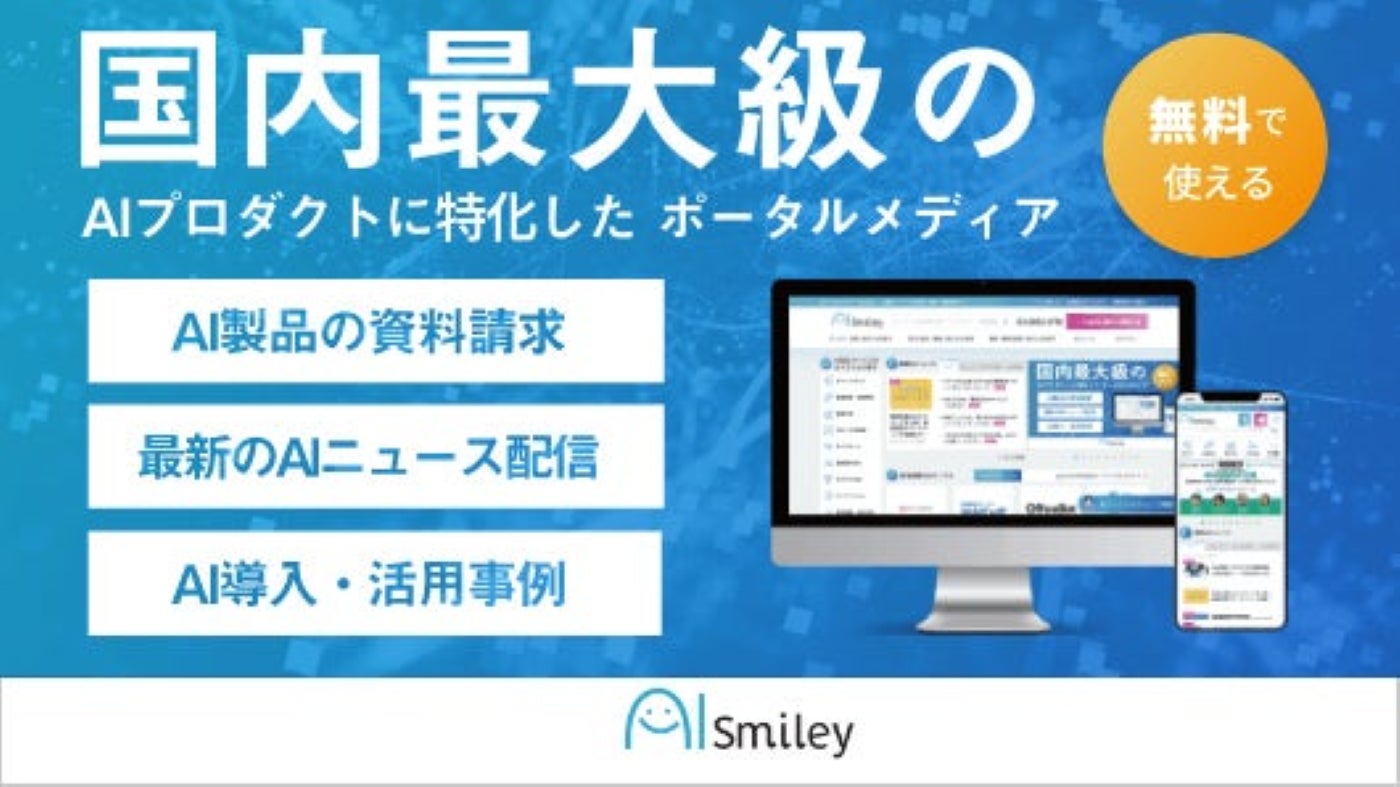 AIsmiley(アイスマイリー)は国内最大級のAIポータルメディアです。AI搭載した製品・サービスの比較や資料請求を無料でご利用いただけます。