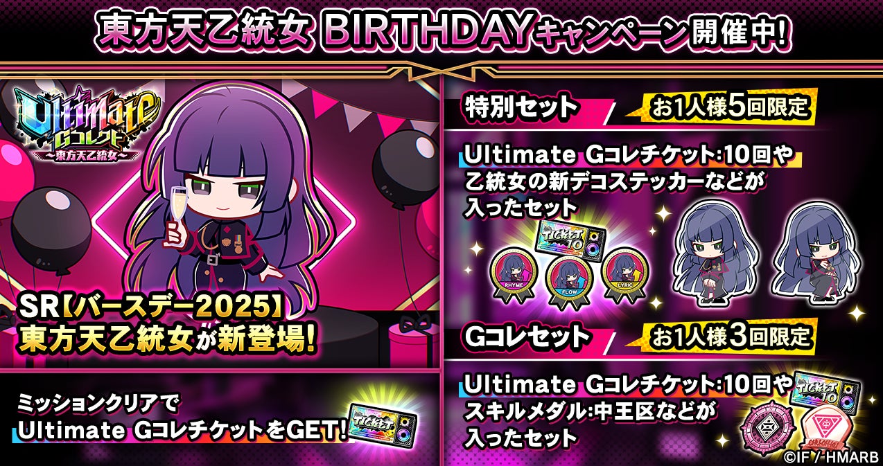 乙統女の誕生日を記念し、「SR【バースデー2025】東方天乙統女」を獲得することができるGコレクトや、乙統女の新デコステッカーが獲得できるアイテムセットを販売しているほか、ビンゴミッションを開催しています。