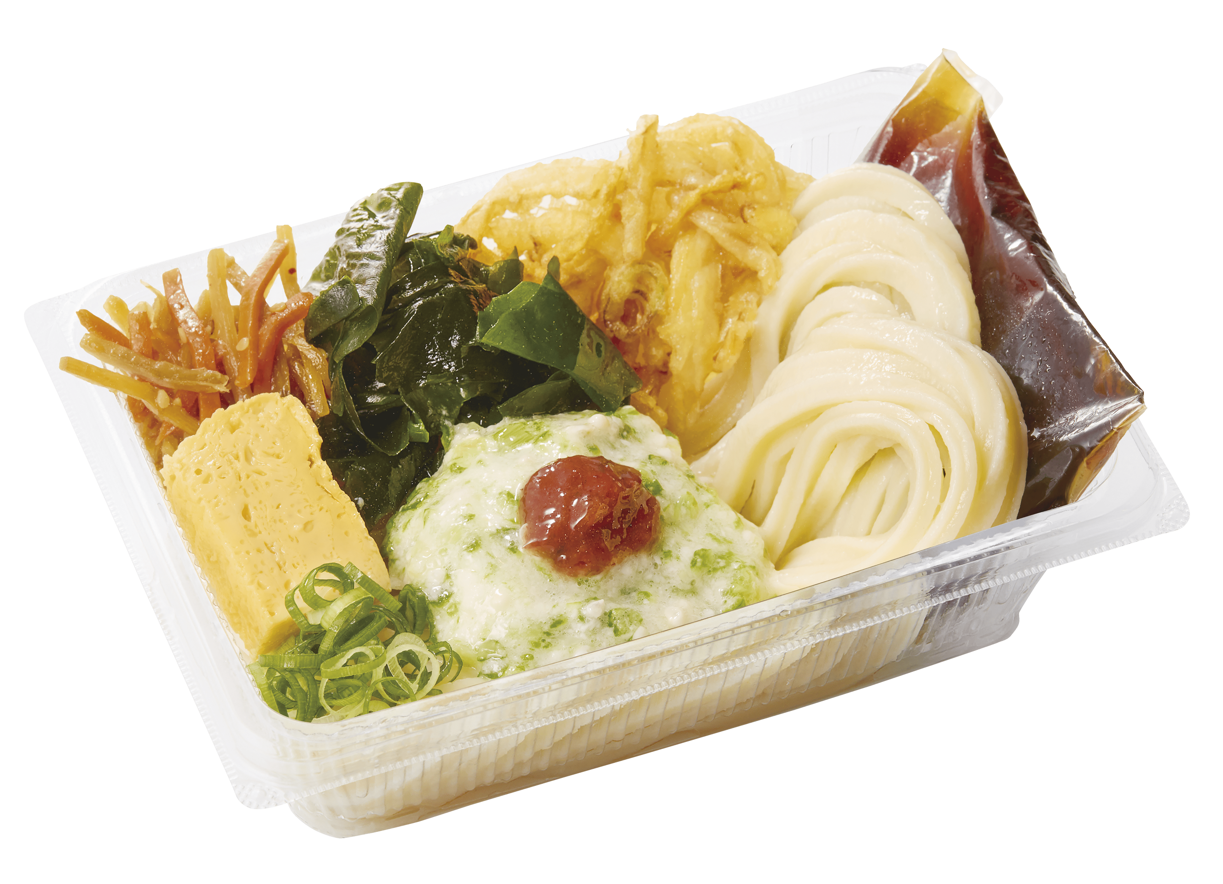 暑さが続くこの季節は、水できゅっと締めた、のど越しのよいうどんがまだまだ嬉しい時期です。『梅とろろオクラうどん弁当』は、梅の酸味やまろやかなとろろ、オクラのねばねば感がうどんと良く絡み、するっと食べられる一品。食欲が落ちがちな日でも、最後の一口までさっぱりとお楽しみいただけます。食べる直前に、冷たいぶっかけだしをかけてお召し上がりください。