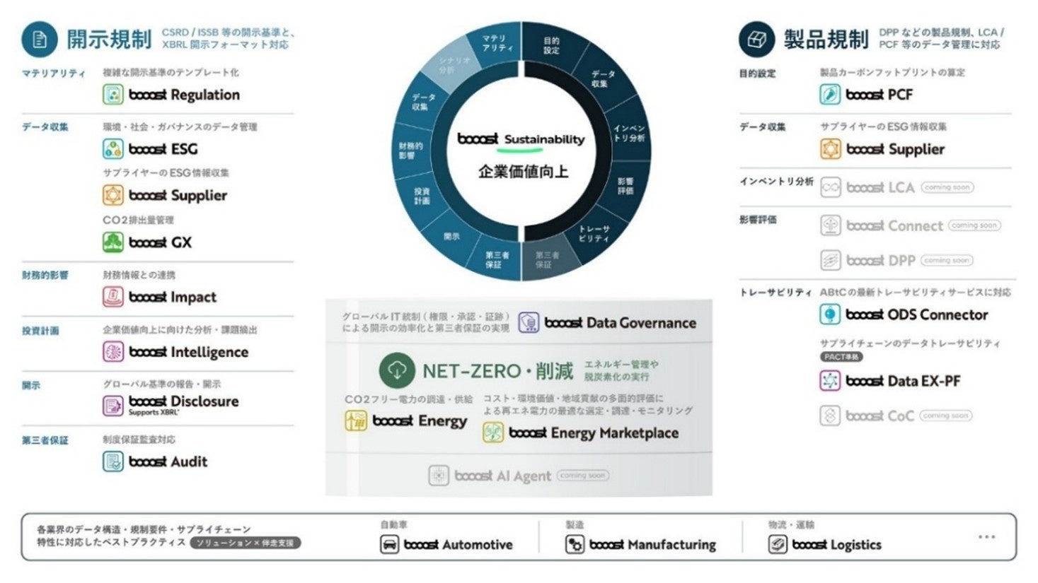 また、業界特化型ソリューションとして、製造業向け「booost Manufacturing」、物流・運輸向け「booost Logistics」、自動車業界向け「booost Automotive」を提供しており、各業界の実務要件に最適化したサステナビリティ対応を支援しています。「booost Sustainability」は提供開始以来、大企業を中心に92か国以上・約2,000社/192,000拠点以上(2025年9月時点)に導入されており、加えて、サステナビリティコンサルティング事業を通じて企業のプロジェクト推進に伴走し、企業価値向上に貢献しています。