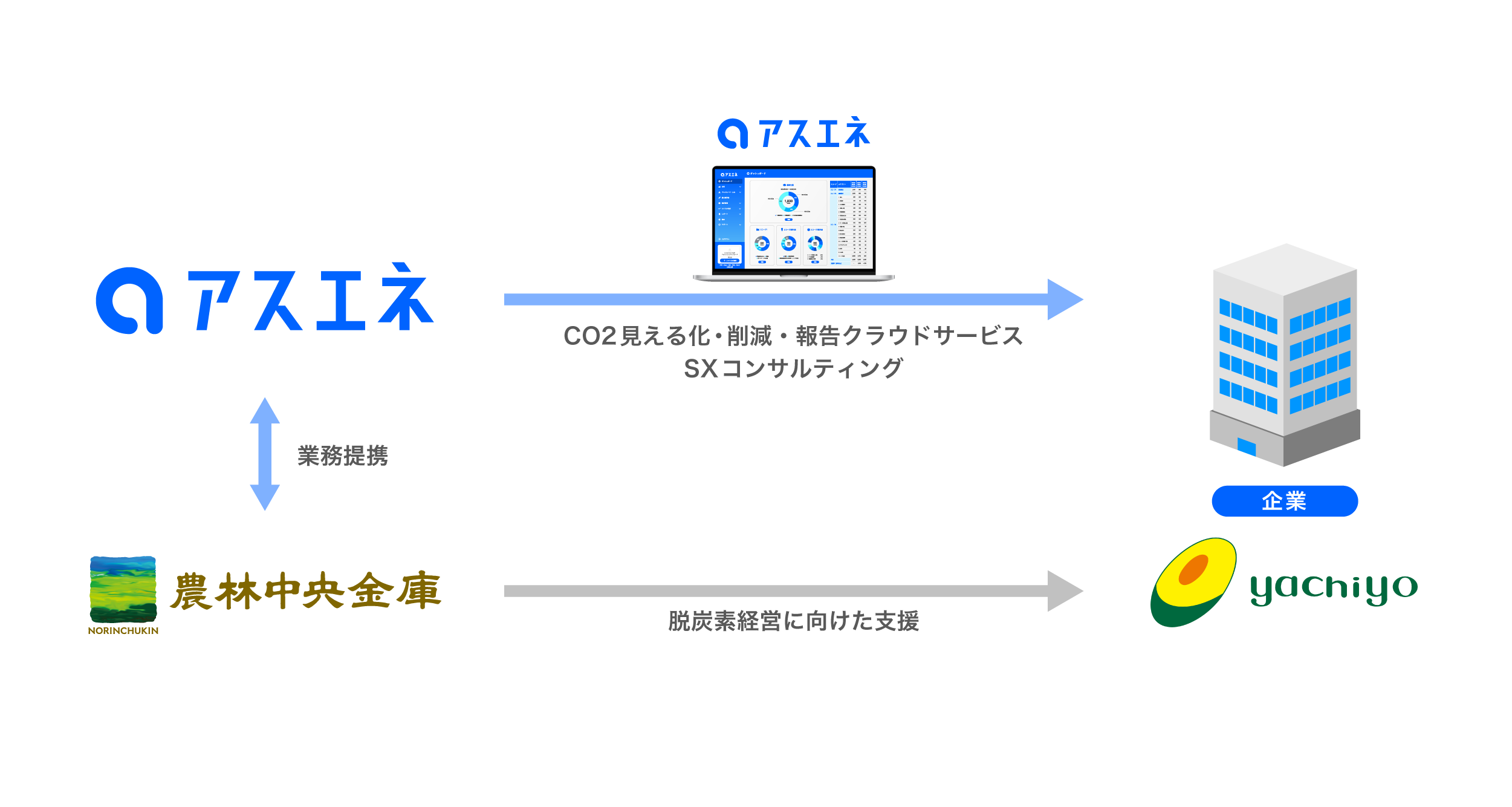 当社と農林中金は2022年1月に連携に合意し、「アスエネ」の導入を通じた、企業の脱炭素に向けた取り組み支援および農業・食品産業における地球温暖化問題の解決を推進しています。農林中金は、「投融資先等のGHG排出量削減 2050年ネットゼロ」を中長期目標の一つに掲げ、投融資先の脱炭素化の取り組みを後押ししています。