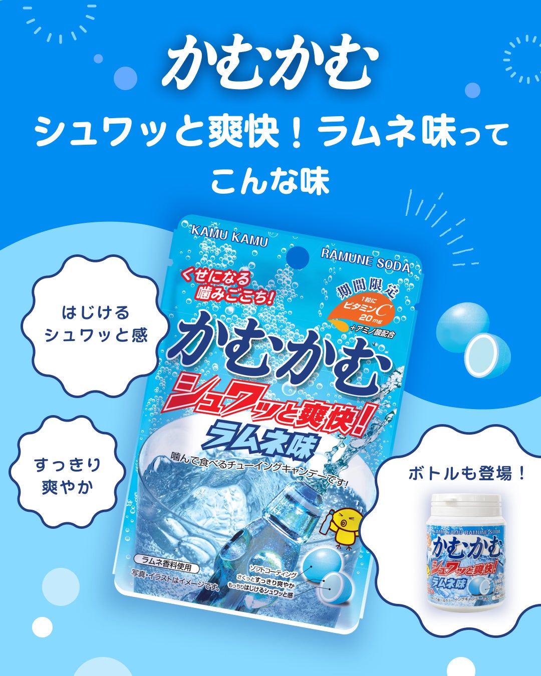 一粒で爽やかな味わいが感じられる「かむかむシュワッと爽快!ラムネ味」春夏限定で再登場!