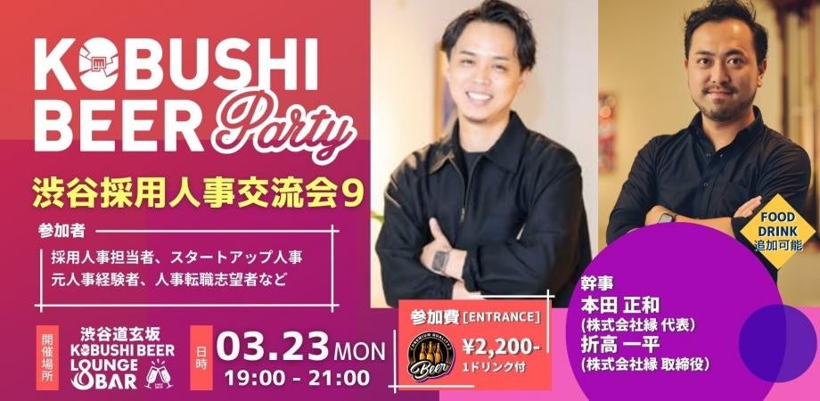 KOBUSHI MARKETING合同会社(東京都渋谷区、代表:井上裕介)が運営する渋谷道玄坂の『KOBUSHI BEER LOUNGE & BAR』では、人と人とを繋ぐユニークな取り組みを行い多くのビジネスチャンスを生み出している。そして今回、2026年3月23日(月)19:00~縁の本田代表・折高取締役主催で、採用コストをムダにしない「辞めない人事」のつくり方について学べる交流会を開催すると発表した。