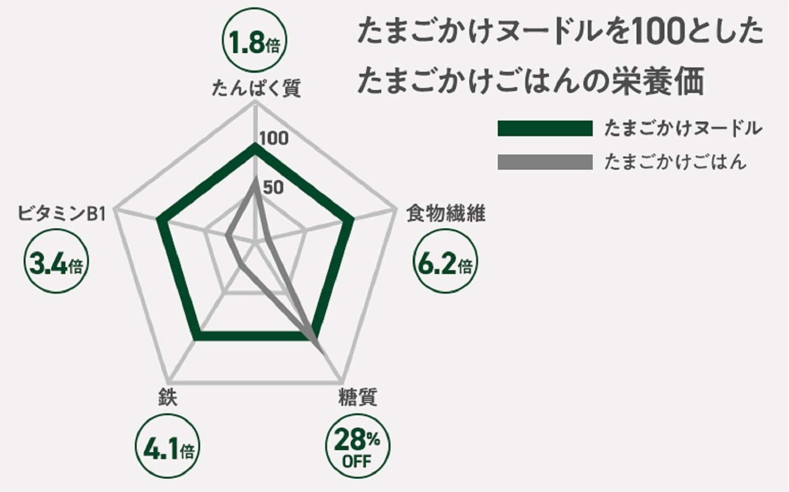 出典:たまごかけヌードル(ZENBヌードル調理前80g(ゆで上がり約200g)+全卵45g+たまごかけヌードルのための野菜だし醤油15g)、たまごかけごはん(精白米60g(白米炊きあがり150g)+全卵45g+濃口しょうゆ6g):日本食品標準成分表2020