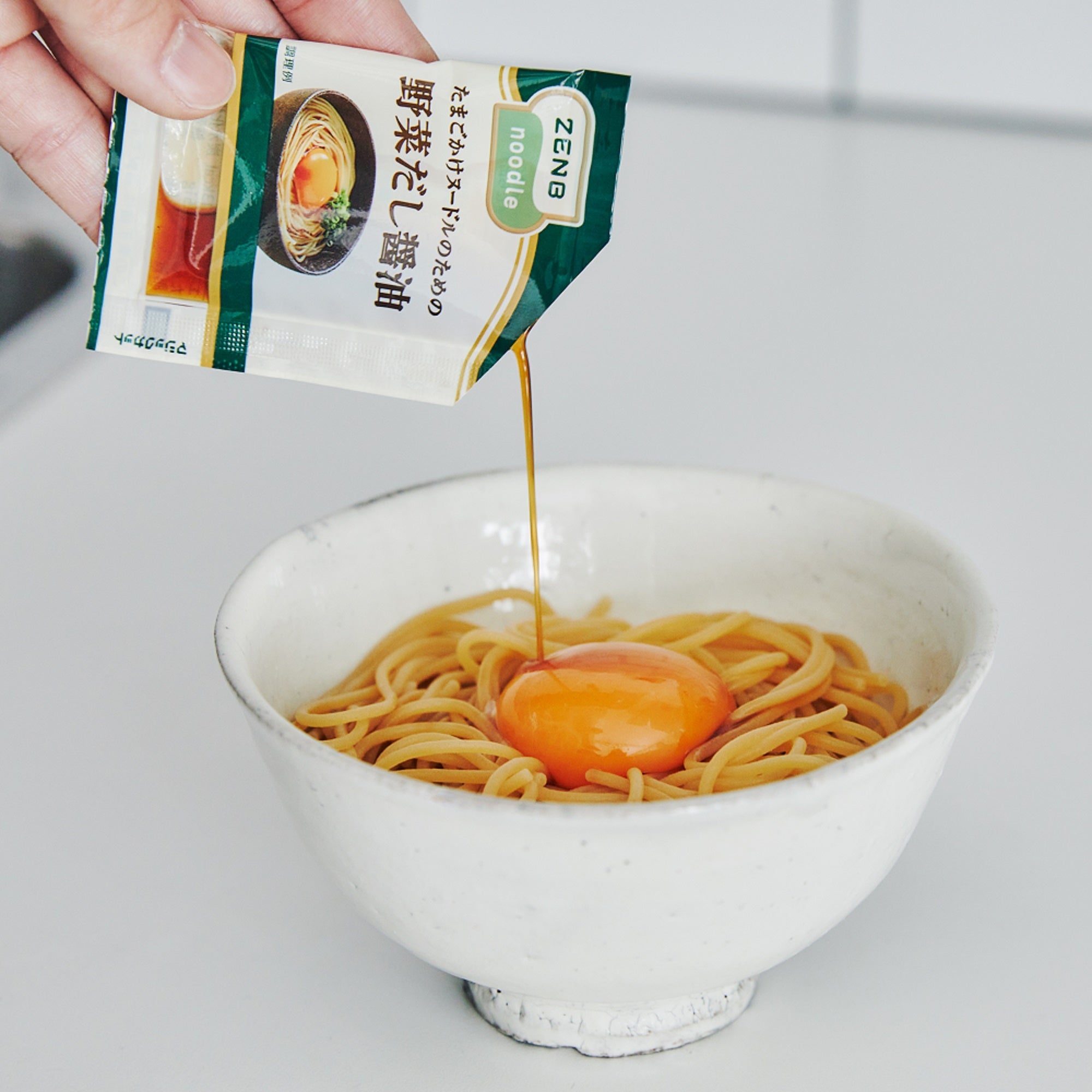 たまごかけごはんならぬ「たまごかけヌードル」は、ゆでたての「ZENBヌードル」に生卵を落とし、お好みの調味料をかけるだけでできあがる、おいしくシンプルな人気メニューです。この「たまごかけヌードル」をさらにおいしく食べてもらうことを追求し、「ZENBヌードル」のほのかな豆の旨みや卵の味わいを引き立てる「たまごかけヌードルのための野菜だし醤油」を発売します。