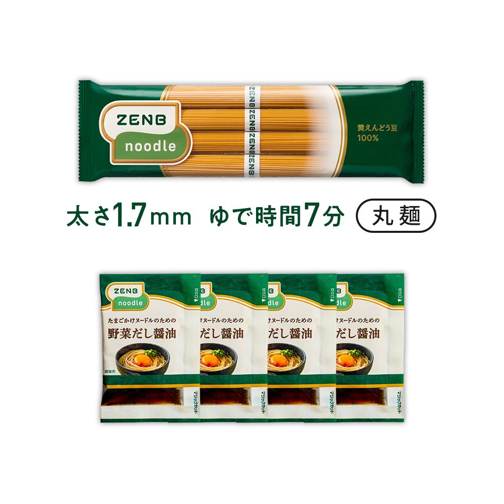 内容:ZENBヌードル1袋(4食)、たまごかけヌードルのための野菜だし醤油4袋