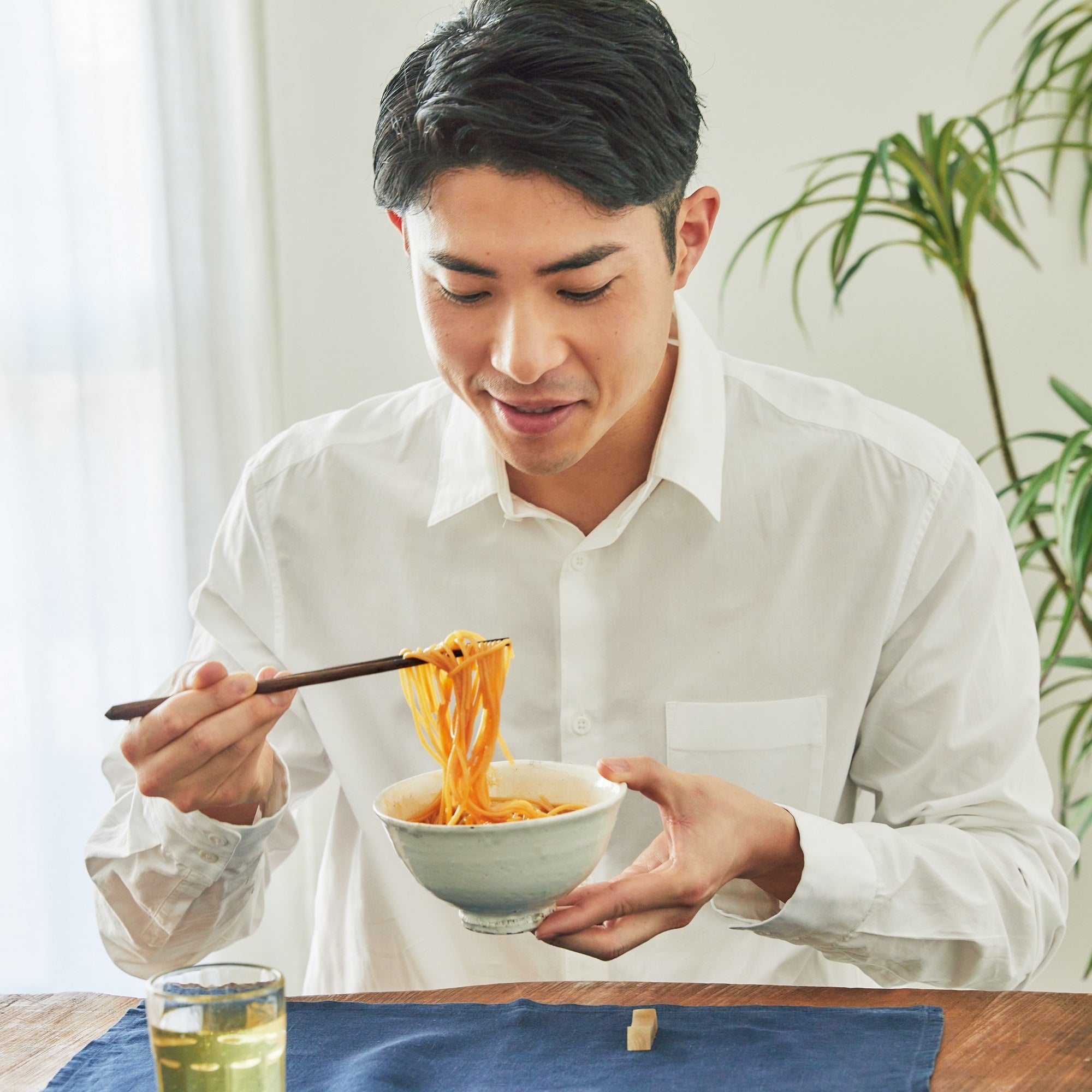 野菜・きのこ・昆布からだしを取り、添加物に頼らない味づくりにこだわりました。素材本来のおいしさを活かしたやさしい旨みのだし醤油をかけることで、まろやかで味わい深い「たまごかけヌードル」が楽しめます。