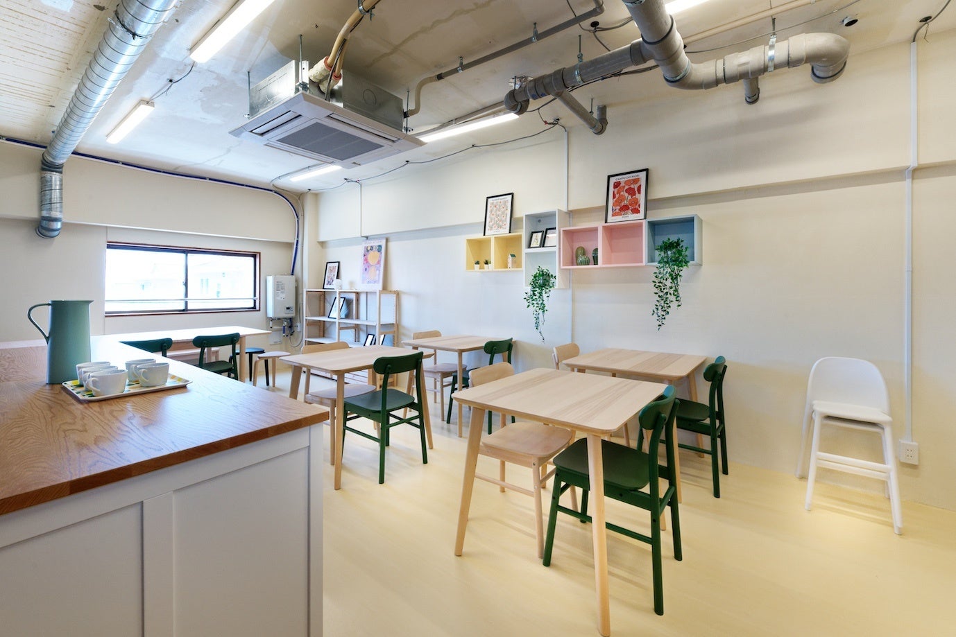 居住者同士や地域の人も参加して料理やお菓子づくりなどの交流ができる場所なので、一緒に作業ができる大きめのテーブルを用意しています。また、居住者が独りでゆっくり過ごす場合も想定し、小さいテーブル席も用意しました。