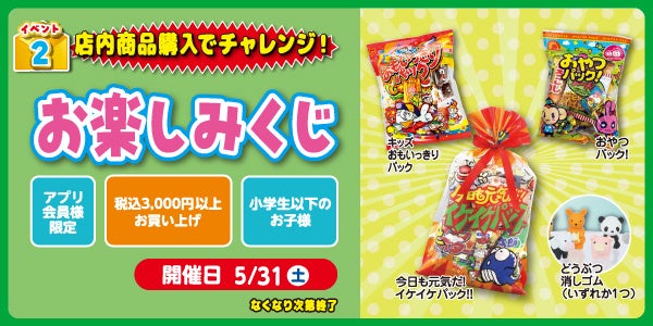 5/31(土)にお楽しみくじを開催します。セール期間中の税込3,000円以上のお買い上げレシートとアプリ会員証をご提示いただくと、お連れの小学生以下のお子様が無料で参加できるイベントです。なくなり次第終了となりますので、お早めにご利用ください。