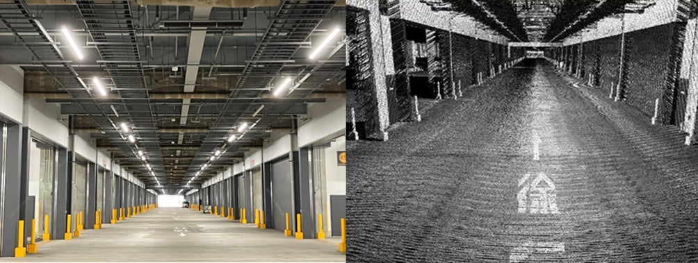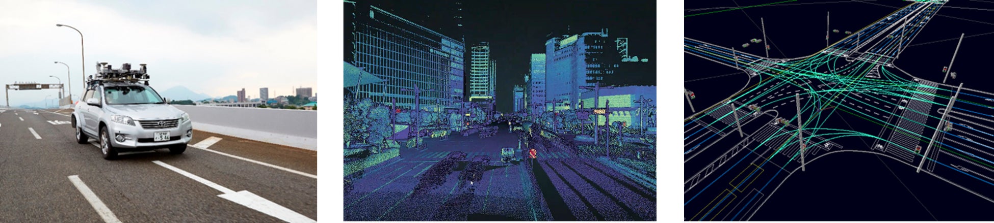 (右) 計測車両を走行させ収集した、施設内の高精度地図用点群データ