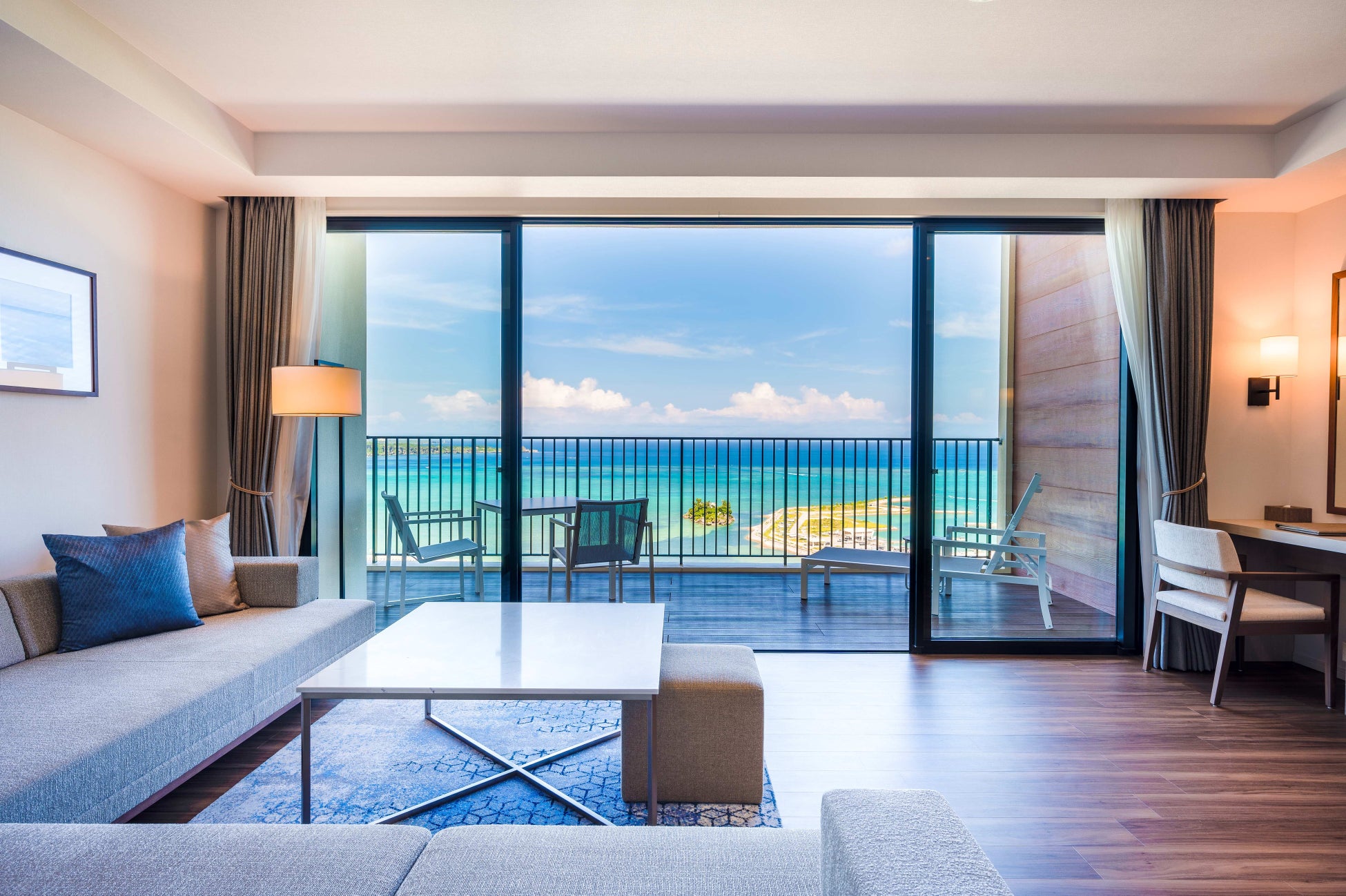 全203室の客室は、⾼台から恩納村の海を⼀望できる全室オーシャンビュー&フラットテラス付きのコンドミニアムスイートが特徴です。リビングとテラスがフラットに連続する空間設計で、室内にいながらも海と空に溶け込むような開放感を体感できます。刻々と変わる空の表情や色彩を見せるオーシャンビューを眺めながら、“沖縄時間を、あなたらしく、心地よく” お過ごしいただけます。
