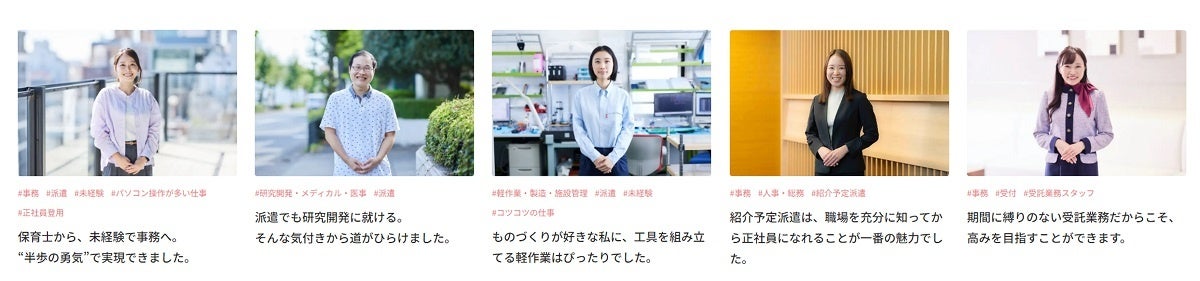 上記以外に、はたらくイメージをより具体的にお持ちいただくために、豊富なコンテンツをご用意しております。通勤交通費の支給や社会保険などの福利厚生、職種ごとの仕事内容・スキル・1日の流れ、キャリアサポート・研修、優待サービスなどの情報を分かりやすくお伝えすることで、派遣というはたらき方の理解・利用促進につなげていきます。ぜひご覧ください。