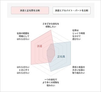 派遣、正社員、アルバイト・パートの特徴をチャートで簡単に比較することができ、自分に合うはたらき方を見つけられます。