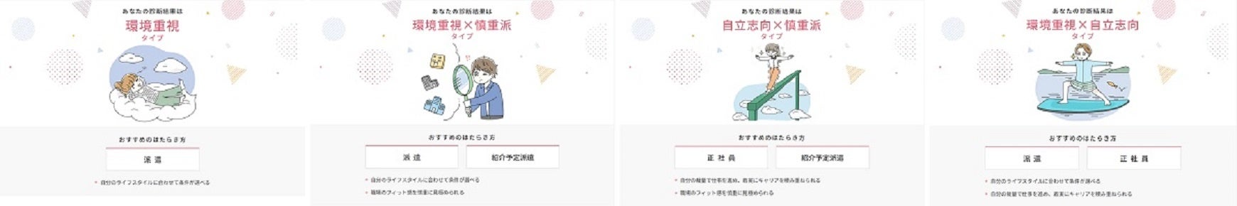 自分に合ったはたらき方のタイプを全部で7種類から見つけられるはたらき方タイプ診断。簡単な設問にYES/NOで回答すると、今の自分が仕事選びで優先したいことが分かり、どんなはたらき方が合っているかを知ることができます。