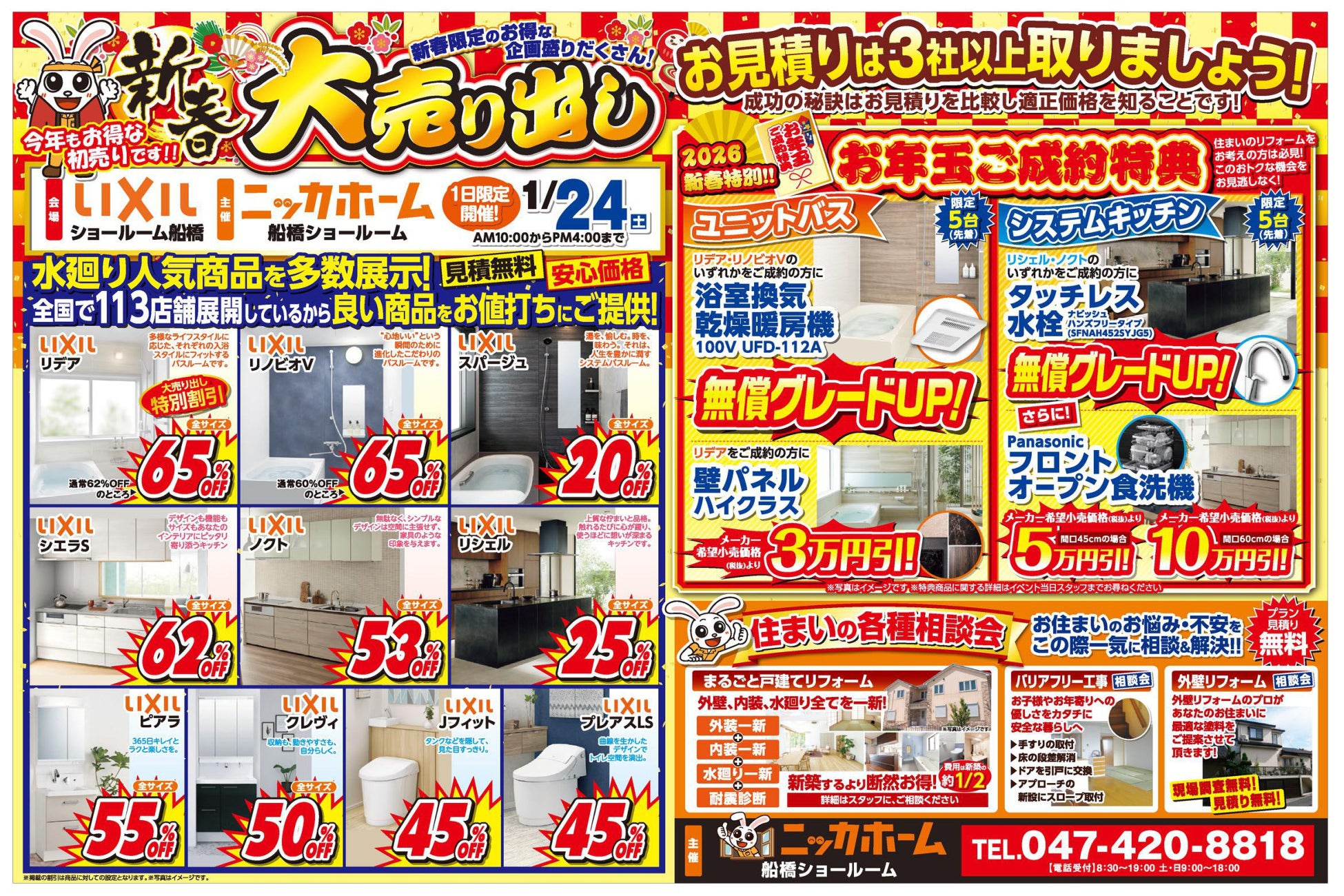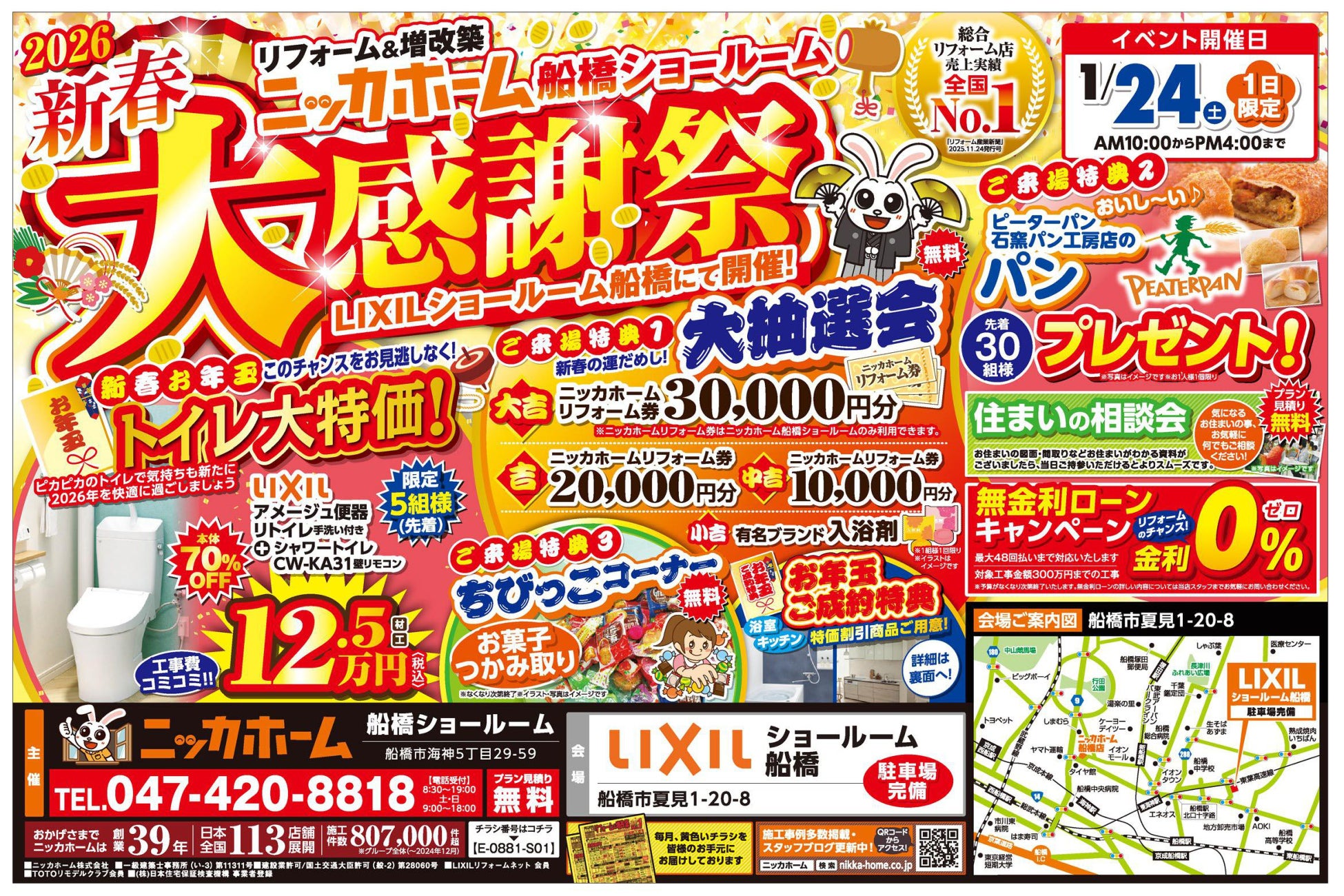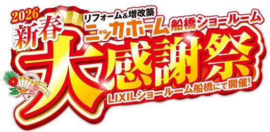 全国100店舗以上展開!2026年に創業39周年を迎える、リフォーム&増改築 ニッカホーム株式会社 (本社:愛知県名古屋市緑区篭⼭、代表取締役社長:西田裕久、以下 ニッカホーム)の ニッカホーム船橋ショールーム が主催の「新春大感謝祭」を、LIXILショールーム船橋 にて開催します!1月24日(土)、1日限定のイベントですので、この機会をお見逃しなく!