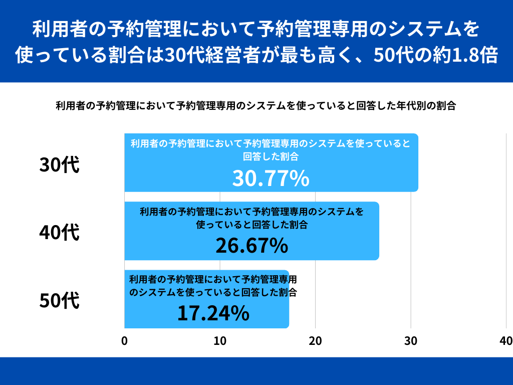 利用者の予約管理において予約管理専用のシステムを使っていると回答した割合を年代別でみてみますと、30代が最も高く30.77%、次いで40代が26.67%、50代は17.24%という結果になりました。