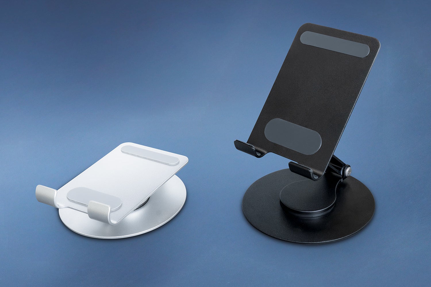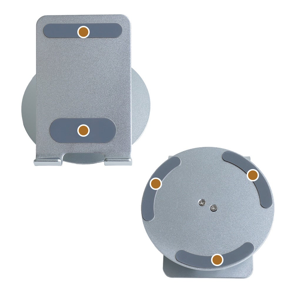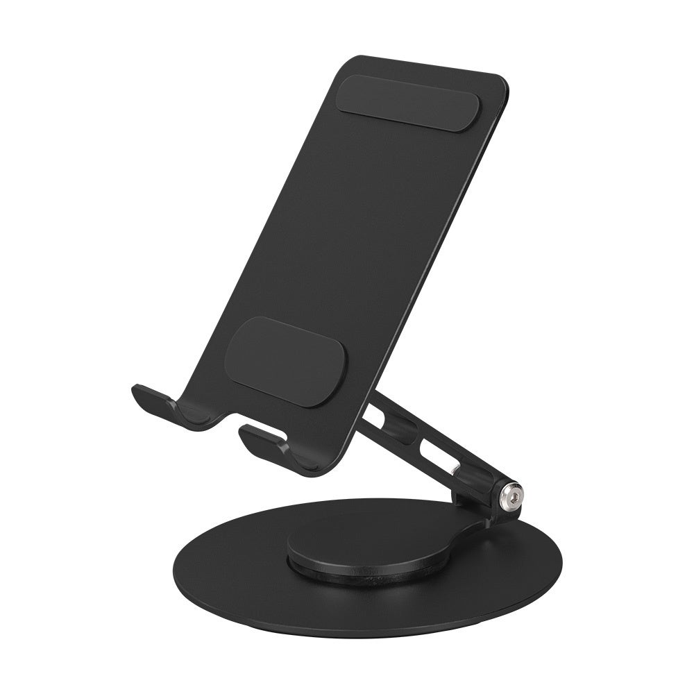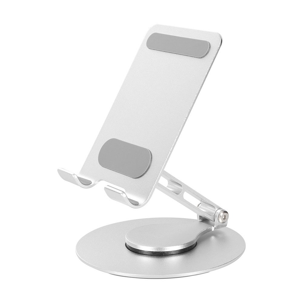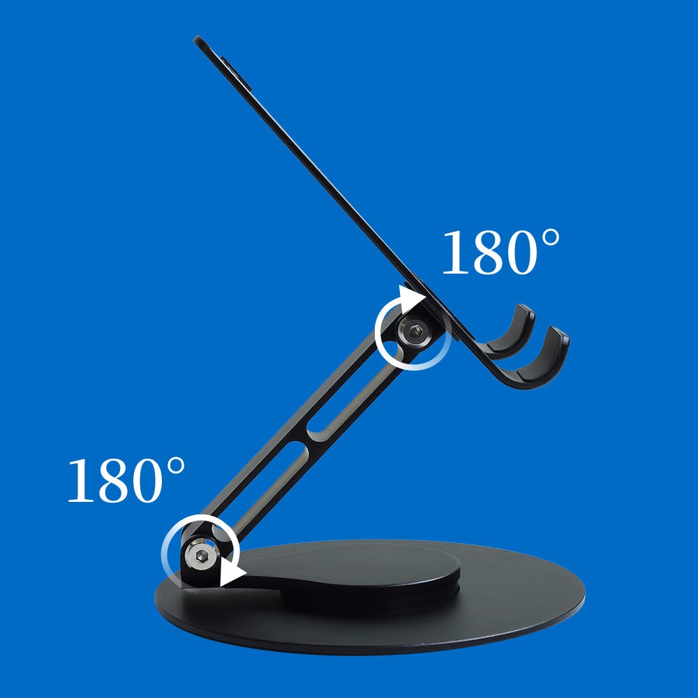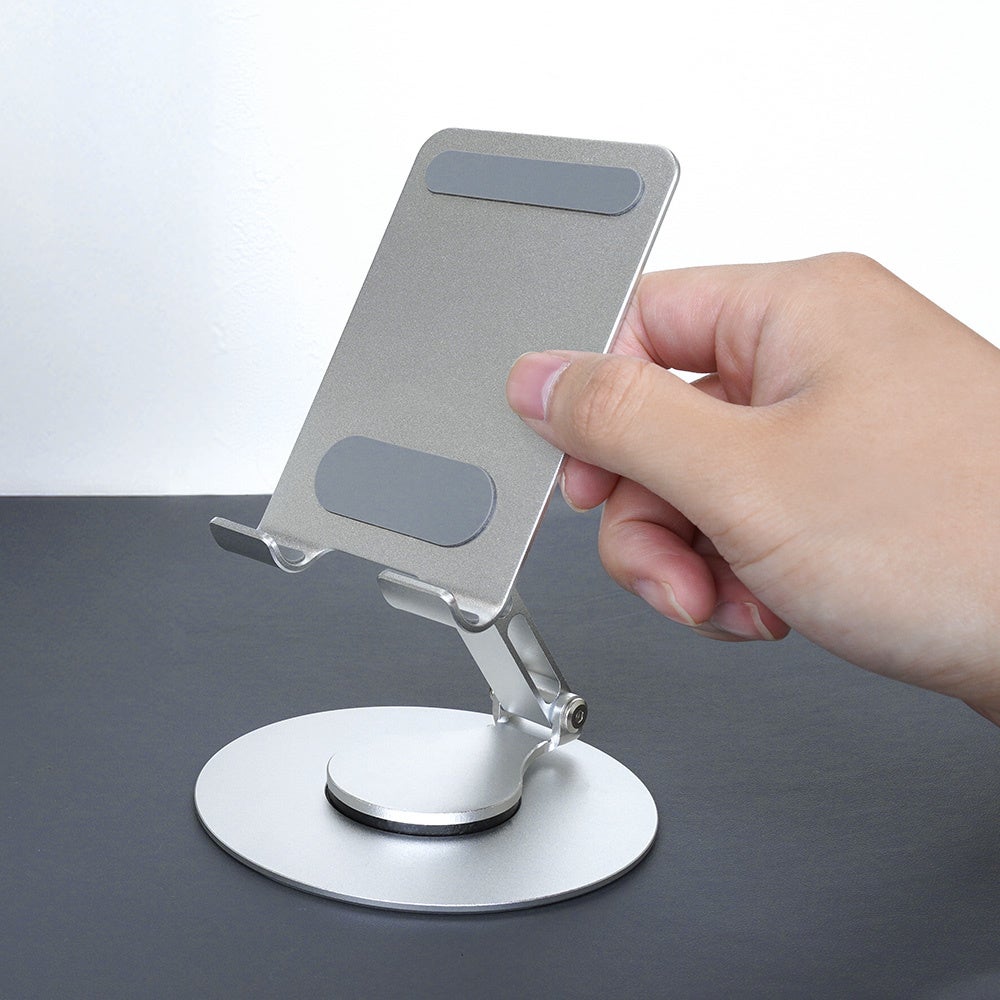 台座部分が360度回転し、角度調節もできる折りたたみ可能なアルミスタンドです。スマートフォンから11インチのタブレットまで幅広くお使いいただけます。