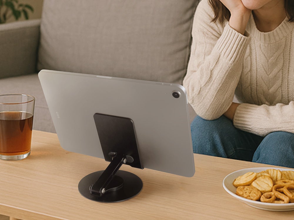 カチカチと軽やかな音とともに台座部分が360度回転し、角度も自由に調節できます。動画視聴はもちろん、会議などで相手に画面を見せるなど、さまざまなシーンにおすすめです。