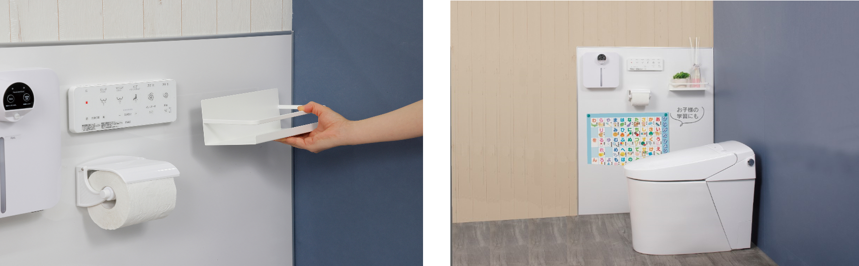 壁面にマグネットパネルを設置することで、リモコンや、トイレ室内の小物を自由にレイアウトでき、人気のフローティング収納をお楽しみ頂けます。