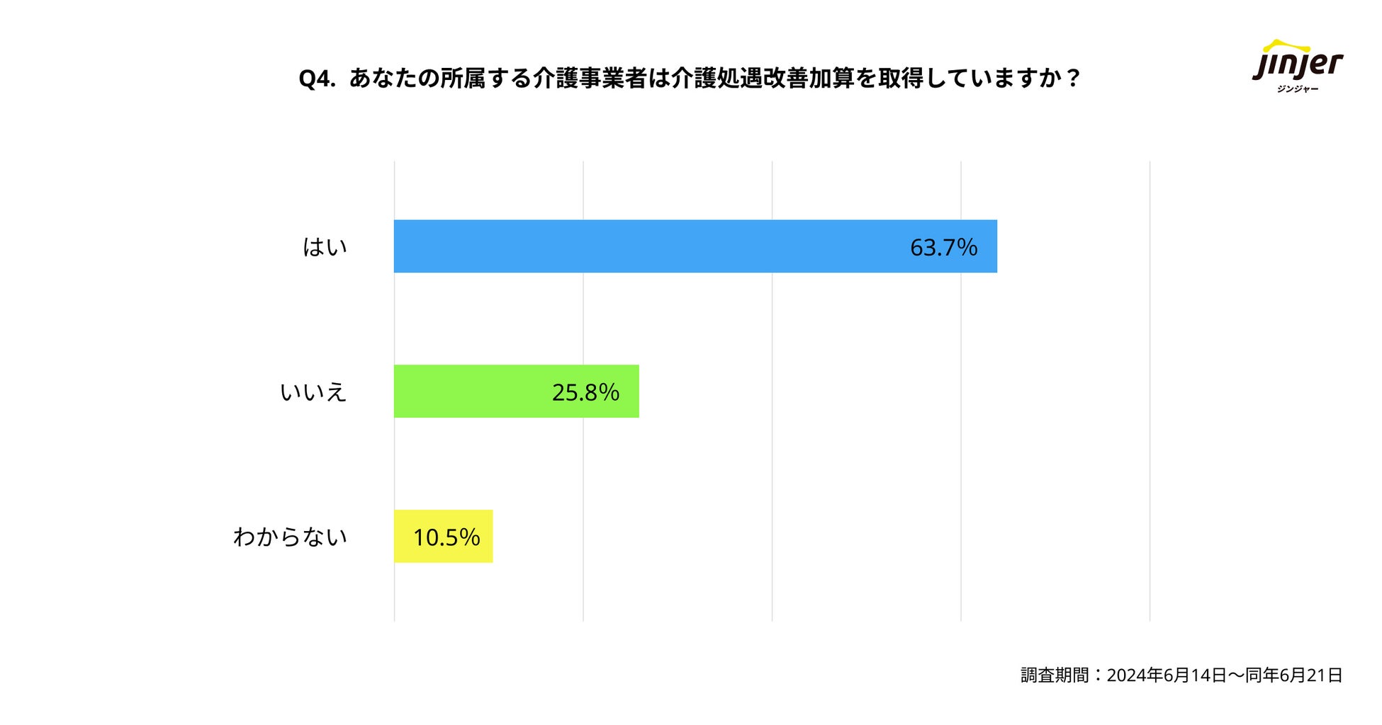 介護事業者へ「介護職員処遇改善加算を取得しているか」について質問したところ、63.7%の介護事業者が介護職員処遇改善加算を取得していることがわかりました。一方で、25.8%の介護事業者においては取得していないこともわかりました。