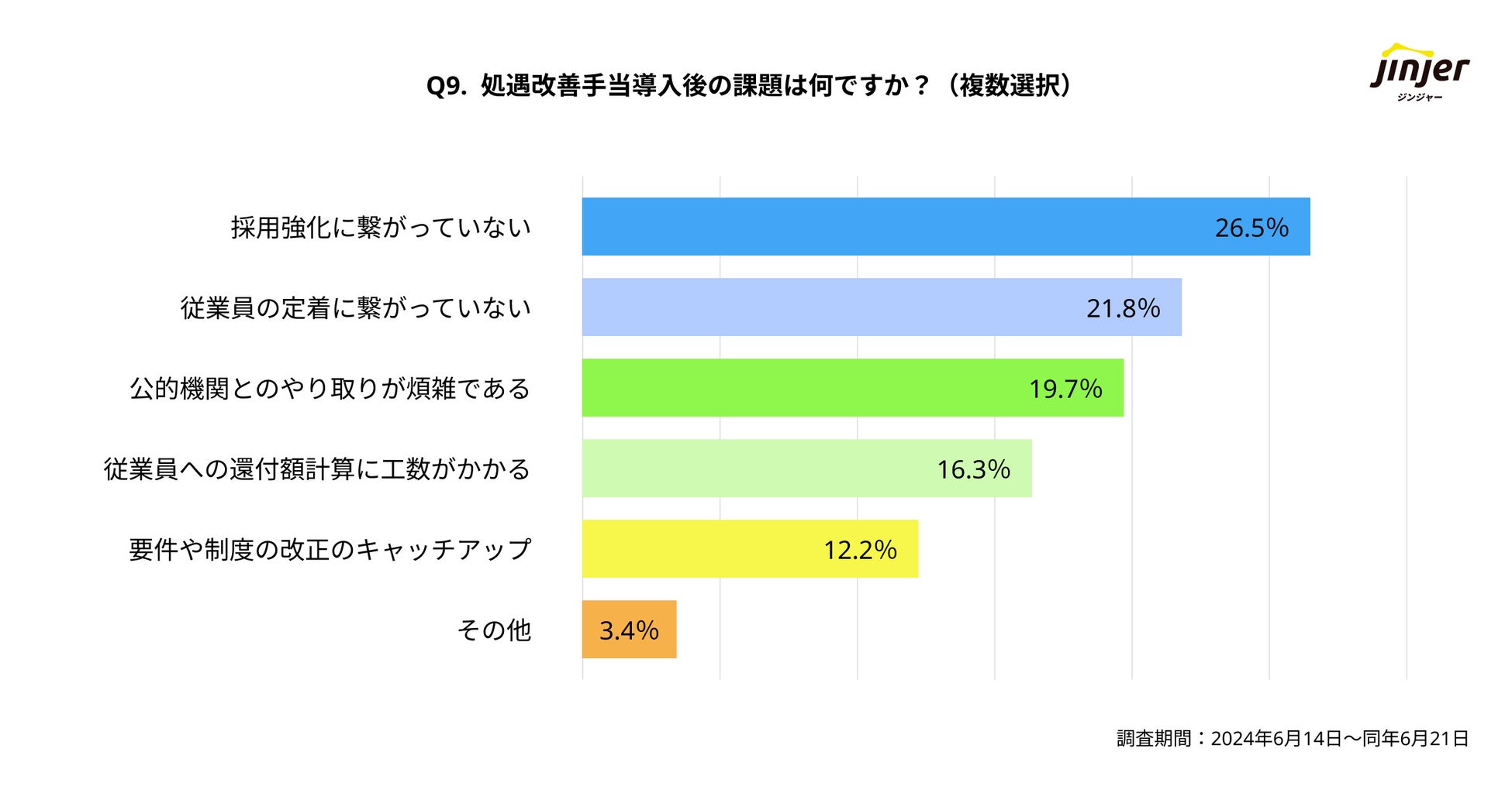 処遇改善手当導入後の課題について質問したところ、最も多くあった意見は「採用強化に繋がっていない(26.5%)」でした。次いで「従業員の定着に繋がっていない(21.8%)」、「公的機関とのやり取りが煩雑である(19.7%)」という結果となりました。