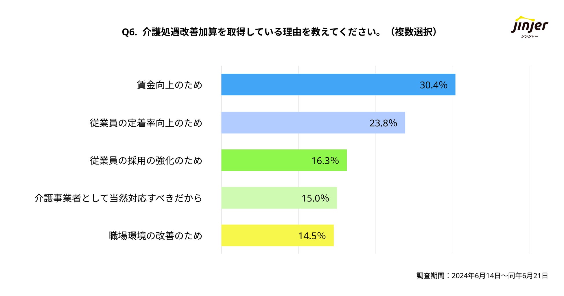 介護処遇改善加算を取得している介護事業者へ、その理由を質問したところ、最も多くあった意見は「賃金向上のため(30.4%)」でした。次いで、「従業員の定着率向上のため(23.8%)」、「従業員の採用強化のため(16.3%)」という結果になりました。