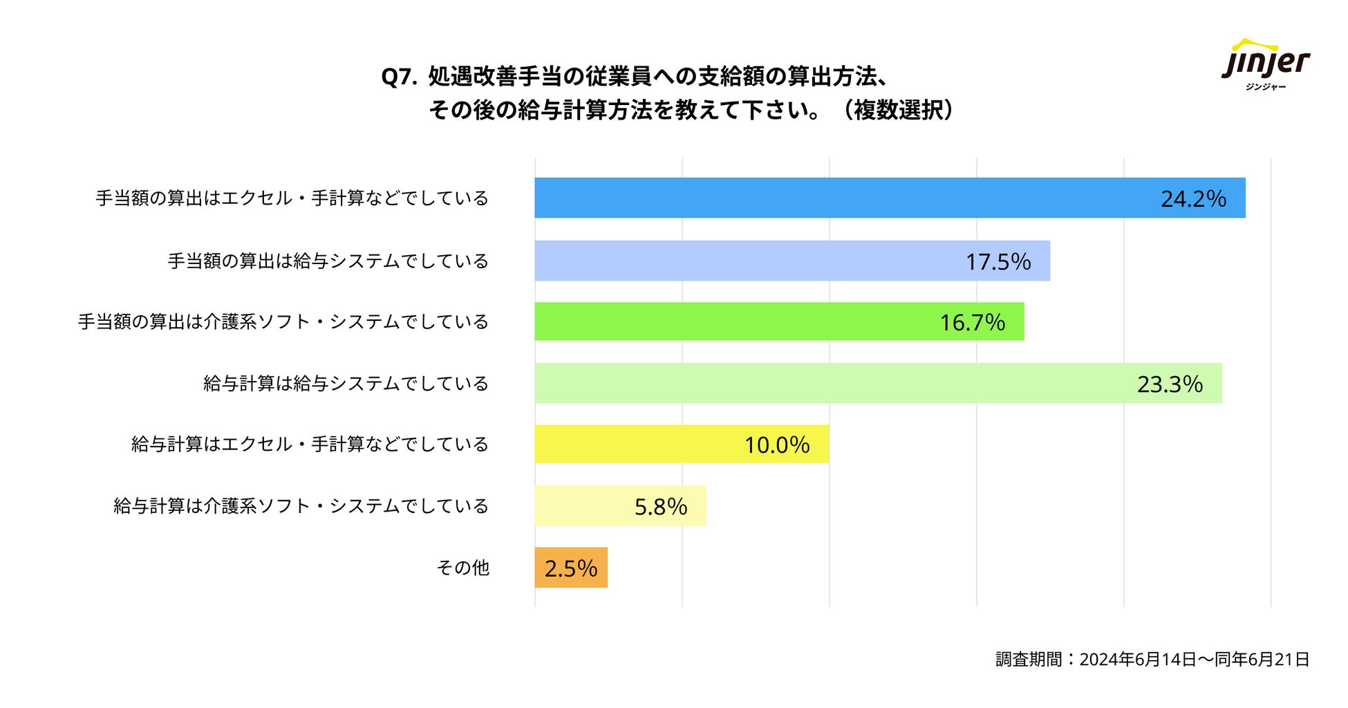 その結果、手当額の算出では「エクセル・手計算等でしている(24.2%)」、「給与システムでしている(17.5%)」という意見が多く得られました。