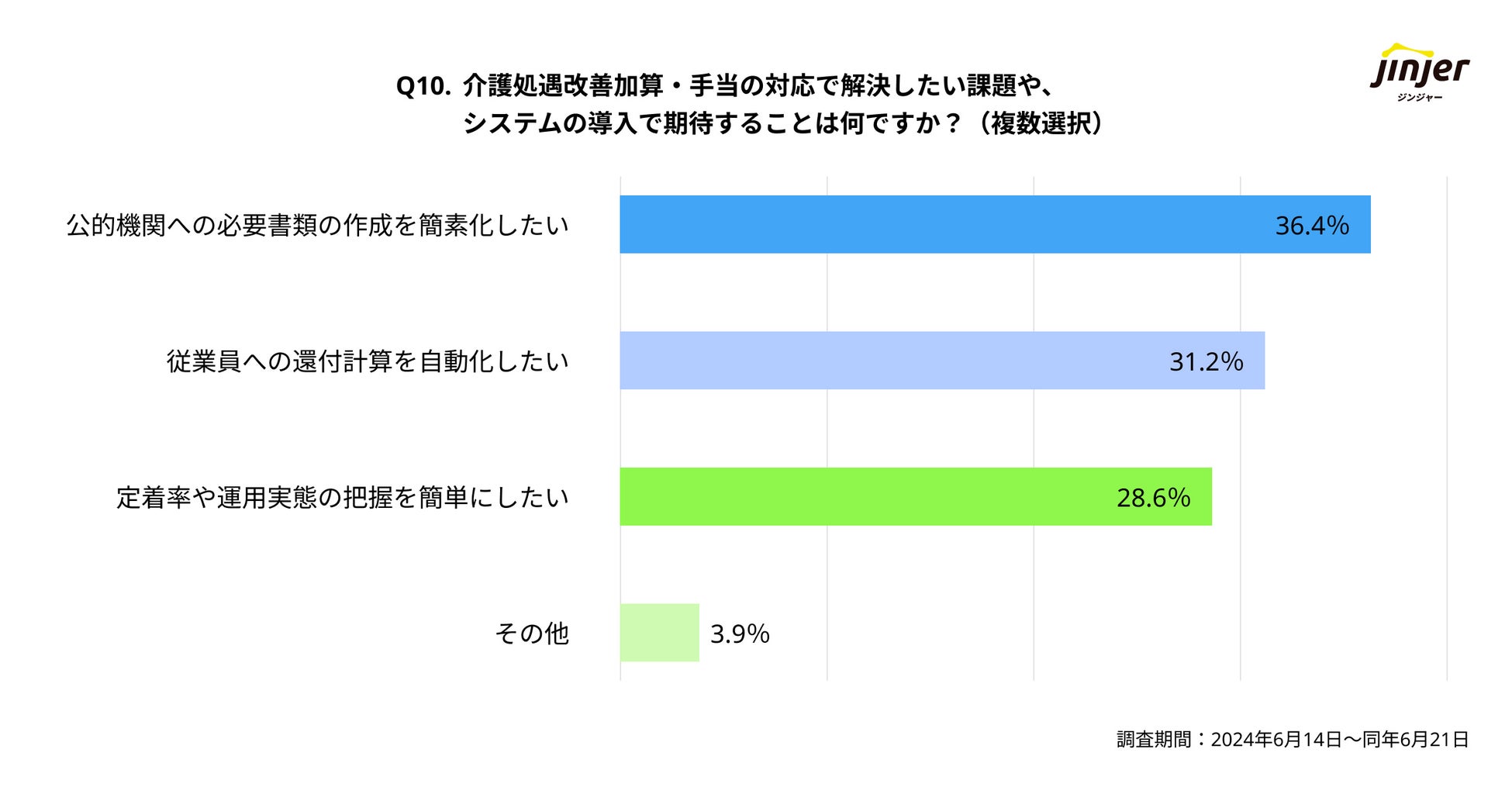 介護職員処遇改善加算・手当の対応やシステム導入で解決したい課題について質問したところ、最も多くあった意見は、「公的機関への必要書類の作成を簡素化したい(36.4%)」でした。その他にも「従業員への還付計算を自動化したい(31.2%)」、「定着率や運用実態の把握を簡単にしたい(28.6%)」と、介護職員処遇改善加算の運用にあたり、業務をより効率化したい、といった声が多く挙げられました。