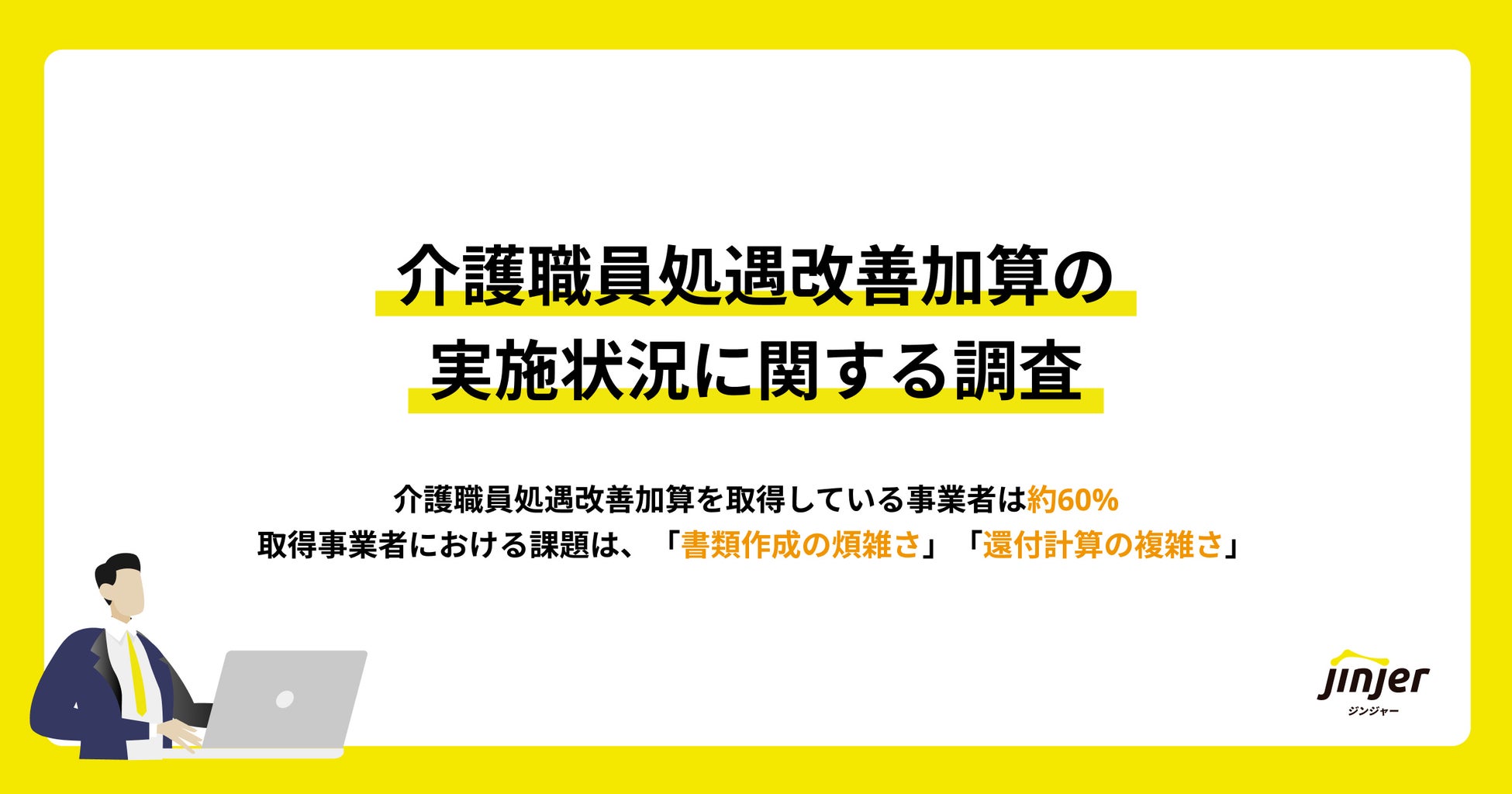 クラウド型人事労務システム「ジンジャー」を提供しているjinjer株式会社(本社:東京都新宿区、代表取締役社長:桑内 孝志)は、福祉領域の企業に所属する人事・総務(役員、部長、担当者)計124名を対象に「介護職員処遇改善加算の実施状況に関する調査」を実施しました。