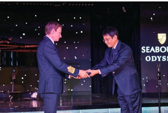 セレモニーにはシーボーン・オデッセイと三井オーシャンフジ両船の関係者が出席し、シーボー ン・オデッセイが約 15 年間の航海で築いてきた功績をたたえるとともに、三井オーシャンフジの新 たなる航海の幕開けを祝いました。セレモニーでは 2009 年の初航海に副船長として乗船して以来、 この船に携わってきたシーボーン・オデッセイ 船長クラシミール・ラデフ氏と三井オーシャンフジ の初代船長キム・ロジャー・カールソンが登壇し、それぞれが本船への想いと三井オーシャンクル ーズへのお祝いを述べました。