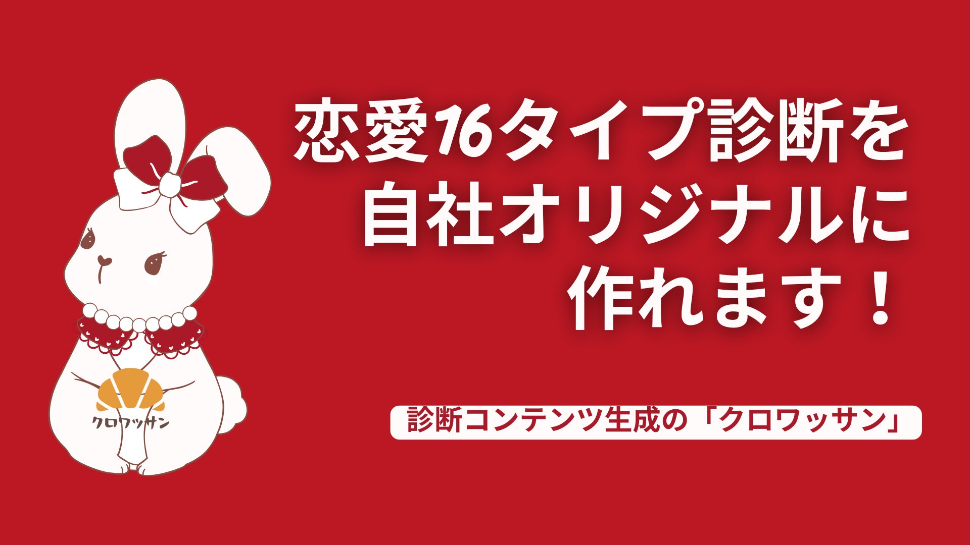 ノーコードでオンライン診断/アンケート/オンラインガチャを作成できるマーケティングツール「クロワッサン」を提供する株式会社on the bakeryは、SNSで話題の“恋愛16タイプ診断”文脈を自社オリジナルで安全に活用できる共同設計プログラムを開始します。専任プランナーが伴走し、診断の設計から、予約・来店・EC・資料請求など“次の一歩”までの導線設計・実装を最短数日で支援。話題化→参加→成果までをワンストップで実現します。