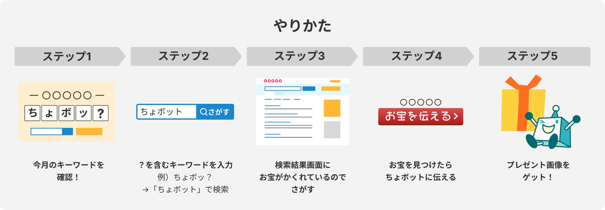 「検索お宝探し」では、特設ページに月替わりでコラボするキャラクターや漫画に関する文字の欠けたキーワードが掲出されます。キーワードを「Yahoo!きっず」で正しく検索すると検索結果にお宝が表示され、そのお宝をオリジナルキャラクターの「ちょぼっと」に報告することでオリジナル画像が入手できます。