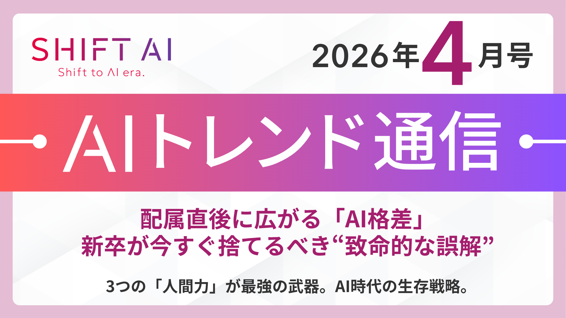 「日本をAI先進国に」を掲げ、AIのビジネス活用を学べる利用者数No.1※のAI大学「SHIFT AI」を運営する株式会社SHIFT AI(東京都渋谷区、代表取締役 木内翔大、以下 当社)より、2026年4月のAIトレンド通信をお届けします。