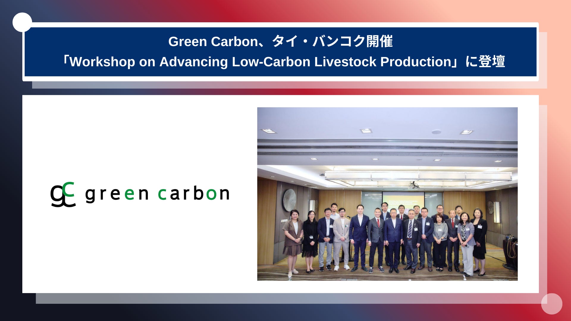 ネイチャーベースのカーボンクレジット創出・販売事業を展開するGreen Carbon株式会社(代表取締役:大北潤、以下Green Carbon(グリーンカーボン))は、2026年3月2日にタイ・バンコクにて開催された国際ワークショップ「Advancing Low-Carbon Livestock Production through a Japan–ASEAN Partnership」(以下「本ワークショップ」)に登壇し、日本における畜産由来温室効果ガス削減の実践事例を発表いたしました。