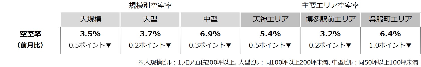 空室率は前月比マイナス0.35ポイントの4.49%と、前月から低下した。昨年竣工した新築ビルを中心に空室消化が進んだことが主な低下要因となっている。エリア別では「呉服町」が前月から1.0ポイントの大幅な低下となった。潜在空室率は前月比マイナス0.29ポイントの6.15%だった。