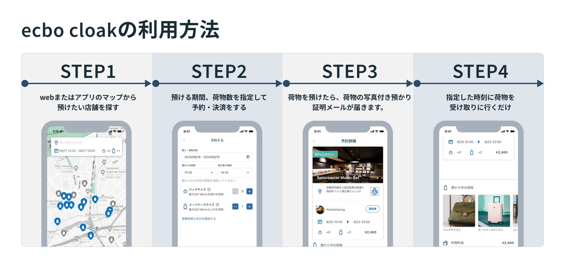主な事業: 荷物預かりサービス「ecbo cloak(エクボクローク)」、宅配物受け取りサービス「ecbo pickup(エクボピックアップ)」の運営