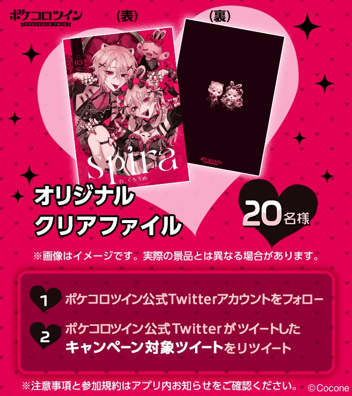 くろうめ さん書き下ろしのキービジュアルを全面プリントしたオリジナルクリアファイルが、抽選で20名様に当たるTwitterキャンペーンを実施します。応募方法は、『ポケコロツイン』公式Twitterアカウント(@PokecoloTwin)をフォロー及び指定ツイートをリツイートするのみ。詳細はアプリ内のお知らせをご参照ください。
