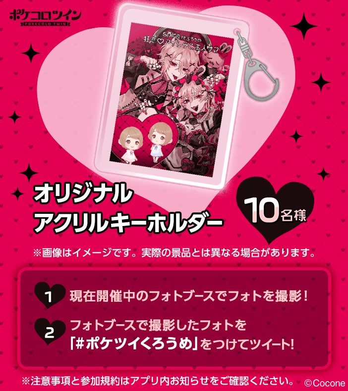 アプリ内の指定フォトブースで撮影したスクリーンショットを、指定ハッシュタグと合わせてTwitterに投稿すると応募完了。投稿画像をそのまま用いた当選者だけのオリジナルアクリルキーホルダーを、抽選で10名様にプレゼントします。詳細はアプリ内のお知らせをご参照ください。