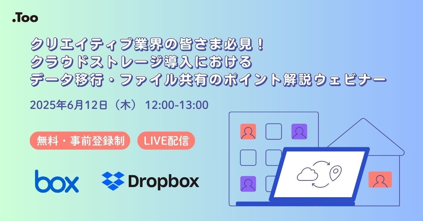 クリエイティブ市場の総合商社・株式会社Too(本社/東京都港区虎ノ門3-4-7、社長/石井剛太、以下Too)は、ウェビナー「クラウドストレージ導入におけるデータ移行・ファイル共有のポイント解説」を2025年6月12日(木)に開催します。