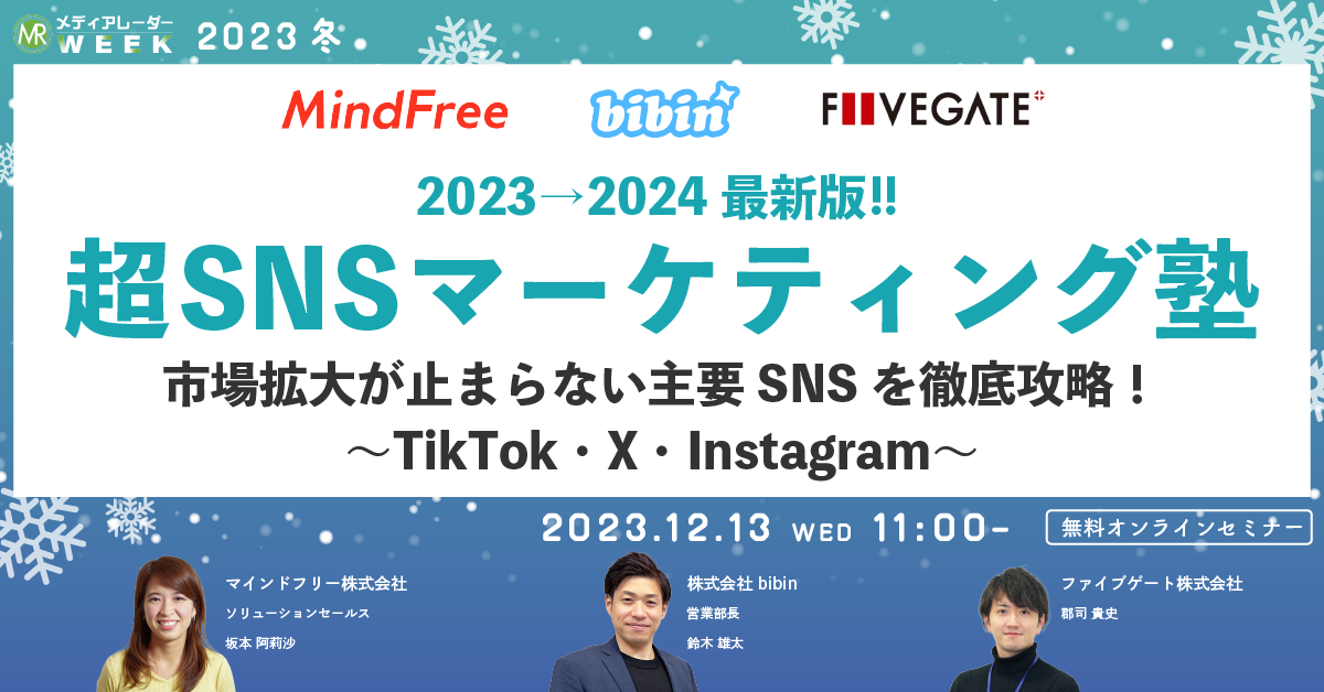 【12月13日開催】2023→2024 最新版!!超SNSマーケティング塾 市場拡大が止まらない主要SNSを徹底攻略! 〜TikTok・X・Instagram〜