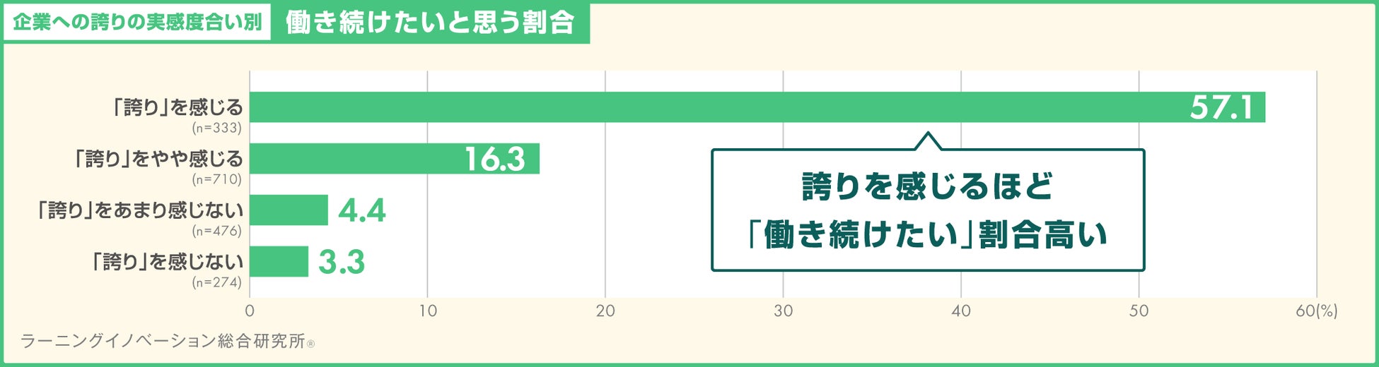 一方、勤務先企業への誇りを「感じない」と回答した人のうち、勤務先企業で働き続けたいと「思う」と回答した割合は3.3%となり、働き続けたいと「思わない」と回答した割合は69.3%となりました。