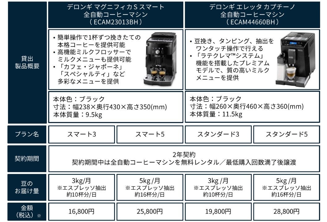 ◆「デロンギケア」: 月額300円(税込)で加入でき、全自動コーヒーマシンが故障した際に、代替機の貸し出しに対応いたします。