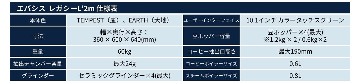 また日本での新発売 (6月頃発売予定)に先立ち、現在グローバルで展開しているエバシス 業務用大型全自動コーヒーマシン「エバシス レガシーL’2m」も参考出展として展示いたします。よりスリムなマシンサイズでありながら、2杯分のコーヒーの同時抽出が可能で、1時間に最大175杯のエスプレッソ、120杯のカプチーノが抽出できる製品を、発売前に体験いただけます。前述のエバシス2モデル同様、実機操作、試飲、タッチ&トライコーナーもご用意いたします。