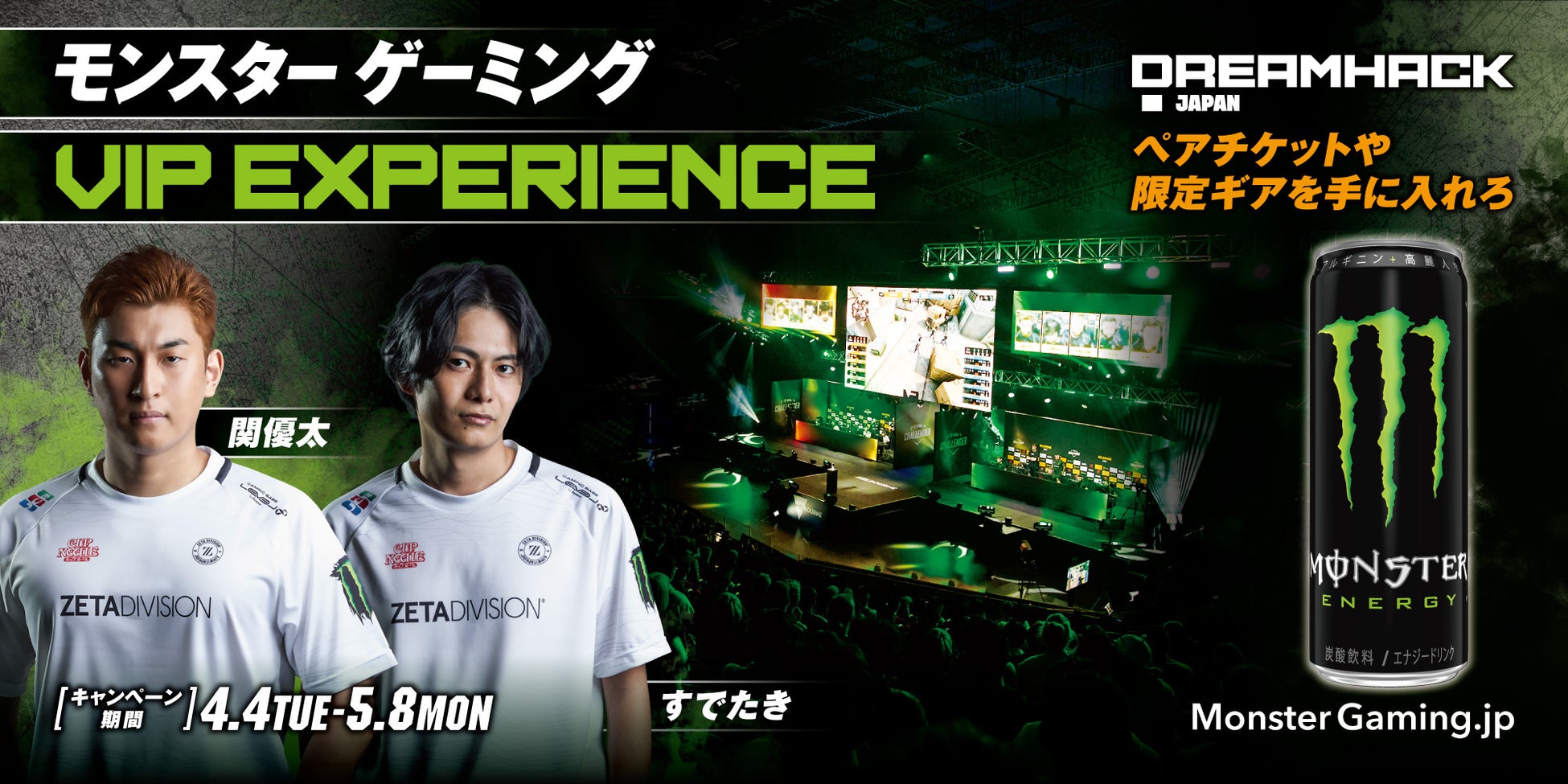 そして、全国のローソンでは4月4日(火)から5月8日(月)の期間中、「DreamHack Japan 2023 Supported by GALLERIA」初開催を記念したキャンペーンを実施いたします。モンスター対象商品を購入したレシートを撮影して応募すると、7本購入で30組60名様に「DreamHack Japan 2023 Supported by GALLERIA 」のペアチケットにZETA DIVISIONのストリーマー、関優太またはすでたきとのミート&グリート券が付いた超VIP体験をプレゼント。その他にも、関優太のサイン入りカードが付いたモンスターのゲーミングチェア、本キャンペーン限定デザインのZETA DIVISION オリジナルTシャツ、モンスターオリジナルのゲーミングバックパックなども当たります。さらに店頭では、ZETA DIVISIONの限定ステッカー(全4種)やモンスターのステッカーが、対象商品を2本同時購入することで先着20名限定で手に入るまたとないチャンス。加えて、キャンペーンサイトでポイントを貯めることで、「DreamHack Japan モンスターエナジー限定動画」を視聴する権利が与えられます。