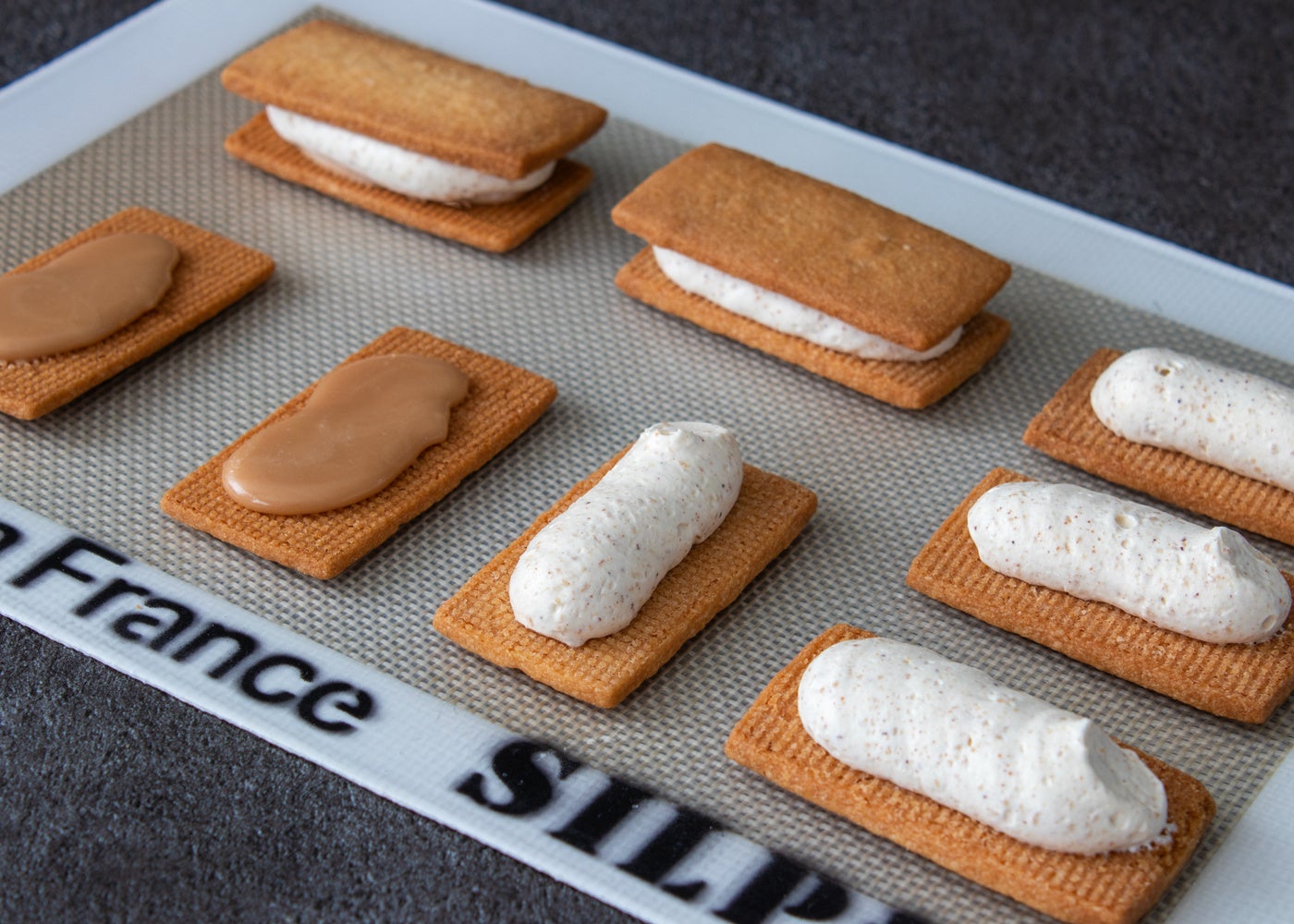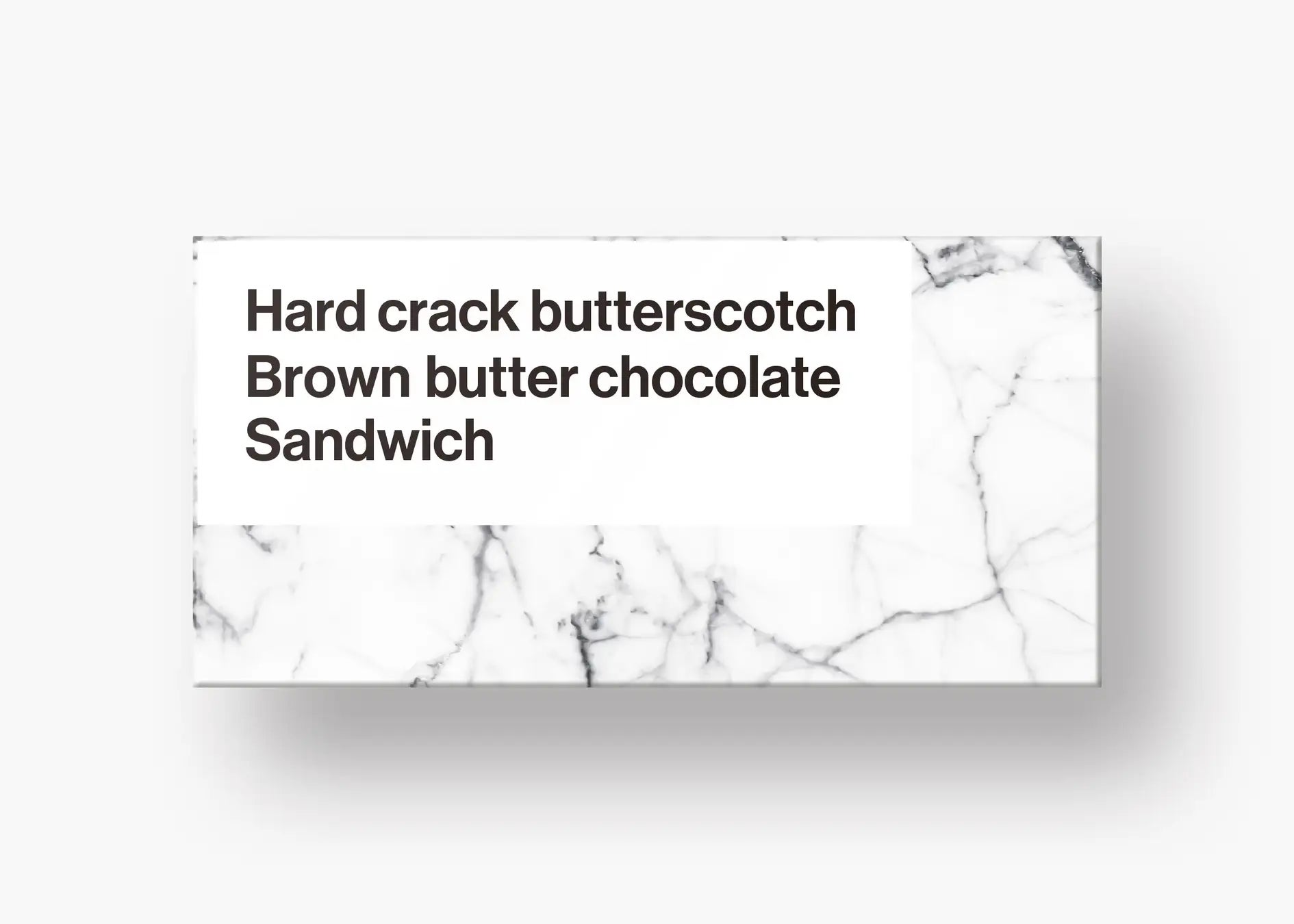 「ハードクラックバタースコッチ焦がしバターサンド」は、サクサク・カリカリとした食感のハードクラックバタースカッチと、ふわりねっとりとした食感のバタークリームという、異なる2層の食感が調和したオリジナルレシピです。焦がしバターの香ばしさとホワイトチョコレートのコクが絶妙にマッチし、てんさい糖を贅沢に練り込んだバタークリームが、濃厚で複雑な味わいを生み出しています。