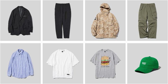 ファーストコレクションは、スウェT、ユーティリティパンツ、ブロードシャツといったジーユーの定番商品を再解釈し、カモフラージュ柄にUNDERCOVERらしい牙のデザインを施したオリジナル柄の「ファングカモ」や、インサイドアウトやカットオフのデザインなどを用いた遊び心のあるコレクションです。また、協業開発した新素材を使用したオーバーサイズのセットアップや、架空のハンバーガーショップ「ノイズバーガーショップ」をモチーフにした高橋盾氏描きおろしのグラフィックなど、本コレクションならではの商品もラインナップしています。