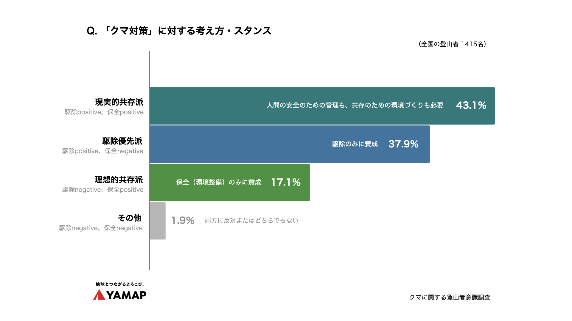 「山は野生動物の領域なので、人はその存在を尊重すべきだ。しかし現在は、クマの数が増えすぎて、人の生活圏(過疎化などによって縮小しています)に侵入している。人命を優先するなら、侵入するクマを駆除すべきだ。」(長野・11〜20年)
